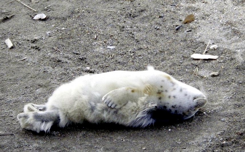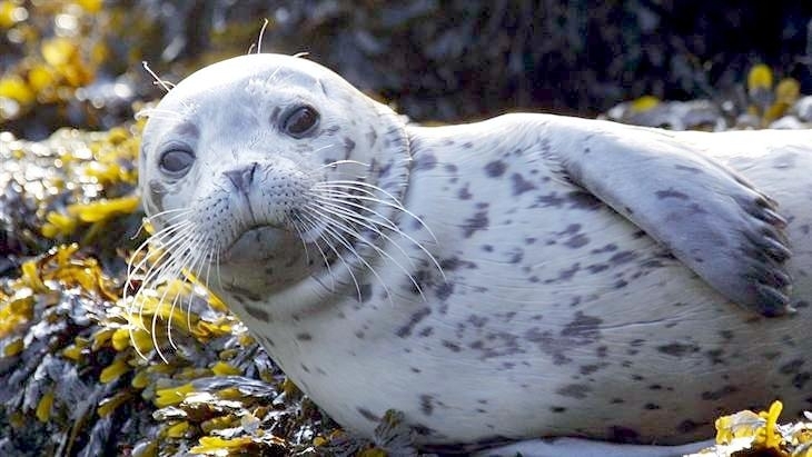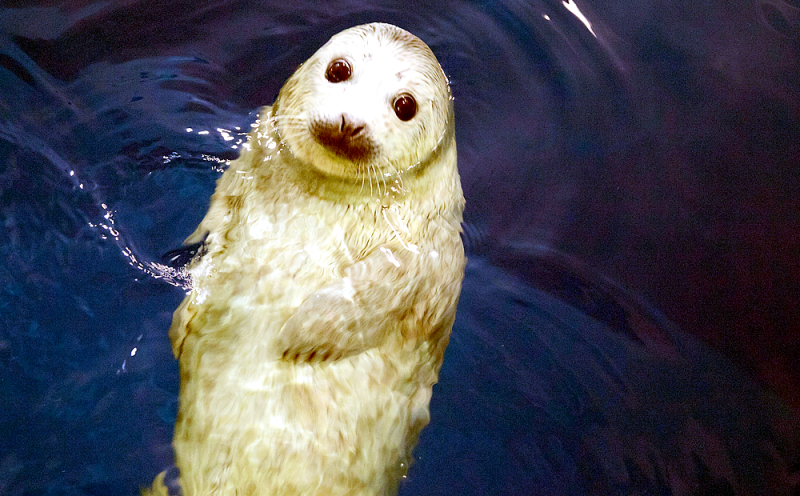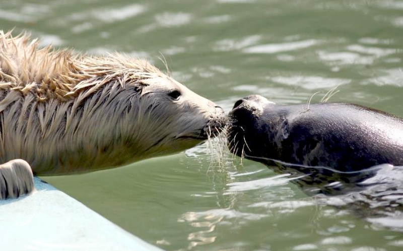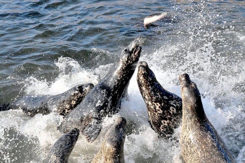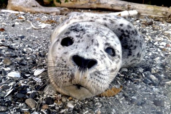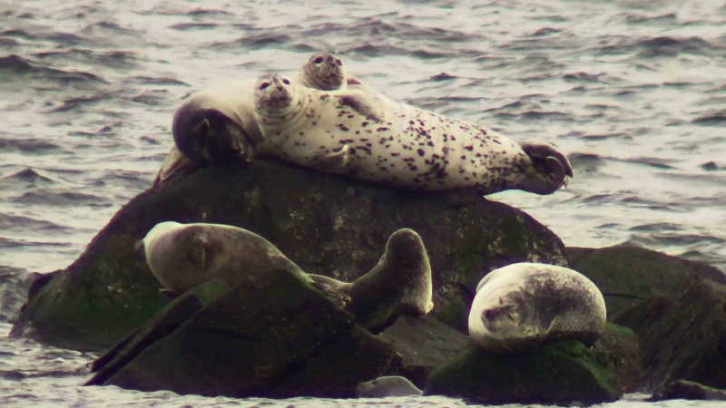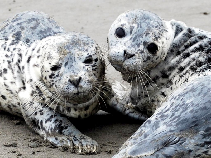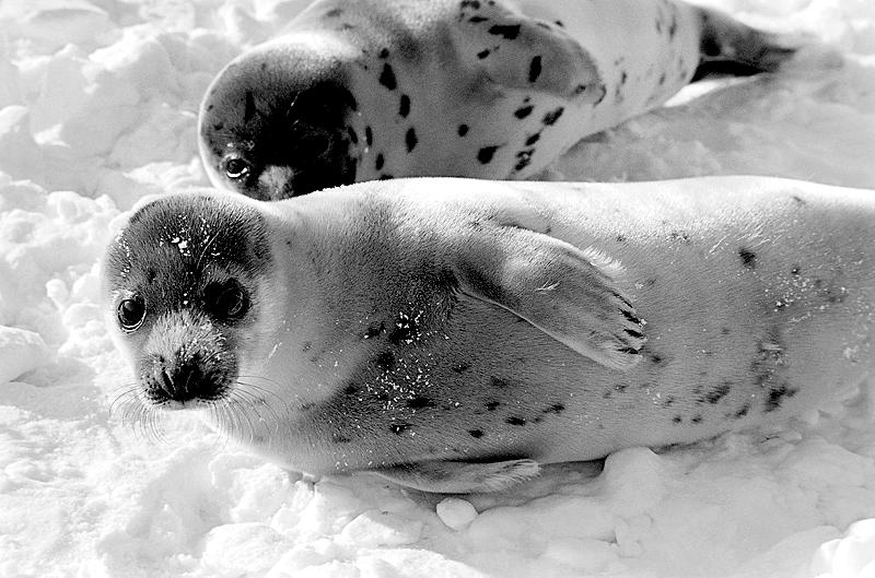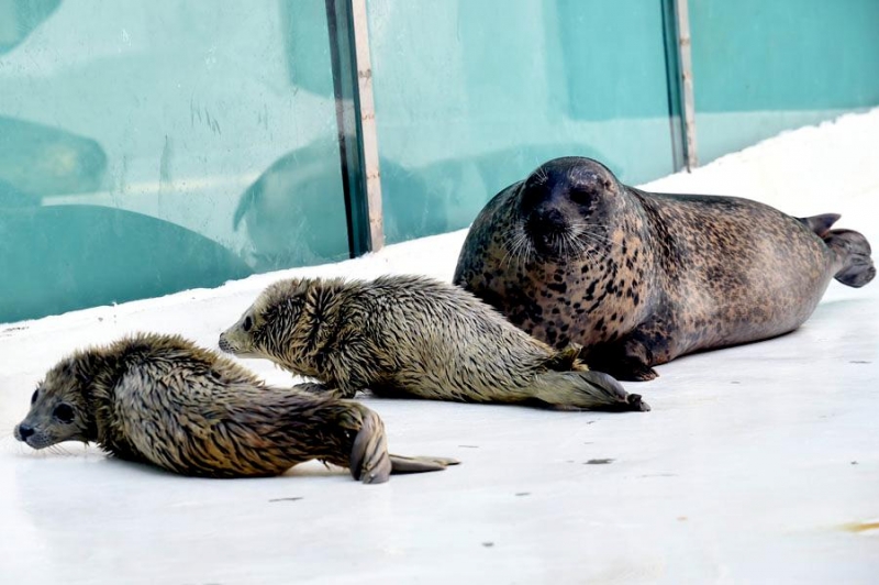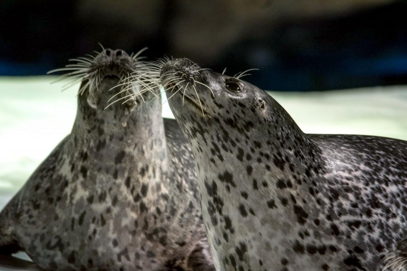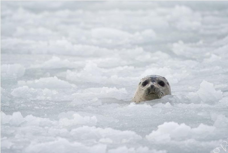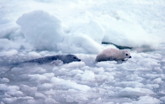 Spotted Seals feed on a wide variety of food sources including crustaceans, cephalopods and fishes. The diet varies by age, by region and by season. Known predators are sharks, Killer Whales, Walruses, Northern Sea Lions, Polar Bears, Brown Bears, Wolves, Foxes and some large seabirds. Adult Spotted Seals can dive to depths of over 300 meters. Breeding season takes place during spring when Spotted Seals are found at the southern edges of the pack ice near cracks between ice floes for access to air and the surface. Known breeding areas are in the Bering Sea, Okhotsk Sea, Sea of Japan and Bohai Sea where some seals give birth on land. Females reach sexual maturity at 3-4 years of age, males at 4-5 years. Newborn pups measure 75-90 centimeters in length and weigh 7-12 kilograms. Pups are born February-May depending on the region, with a woolly white coat that is molted 4-6 weeks later around the same time the pup is weaned. The Spotted Seal pup remains on the ice or on land for the first few weeks after it is weaned, then gradually learns to dive and feed diving up to 80 meters. The pup mortality rate for the first year is around 45%. Families of 3 seals are often observed during breeding season consisting of a Spotted Seal female, her current mate and her pup likely sired with a different mate from the previous breeding season. It is likely that the males join the females about 10 days before she gives birth, then the pair mates after her pup is born.