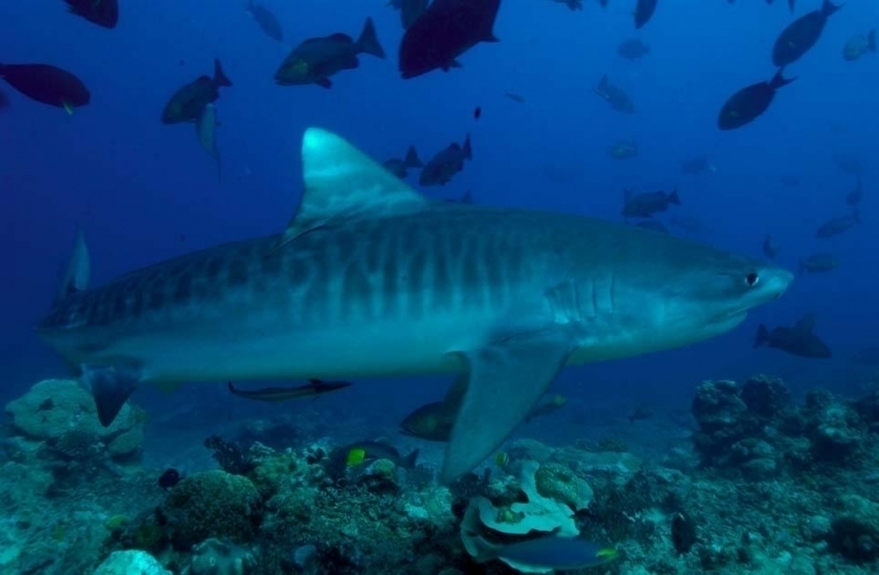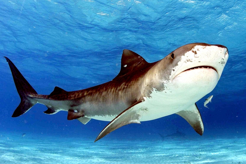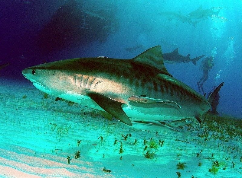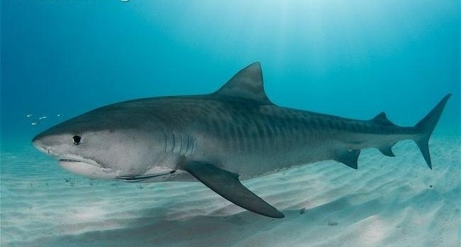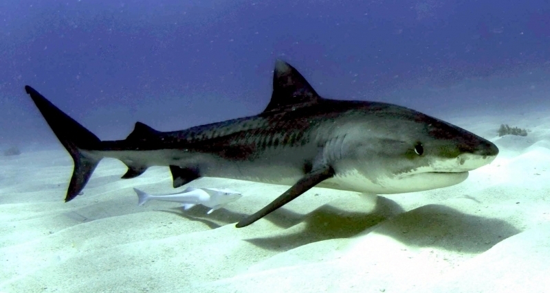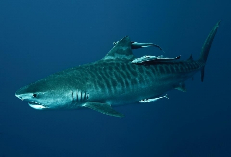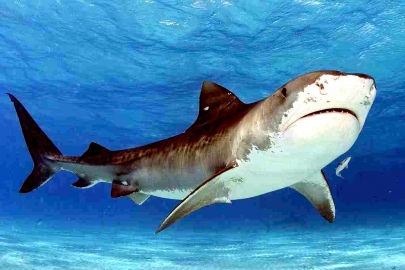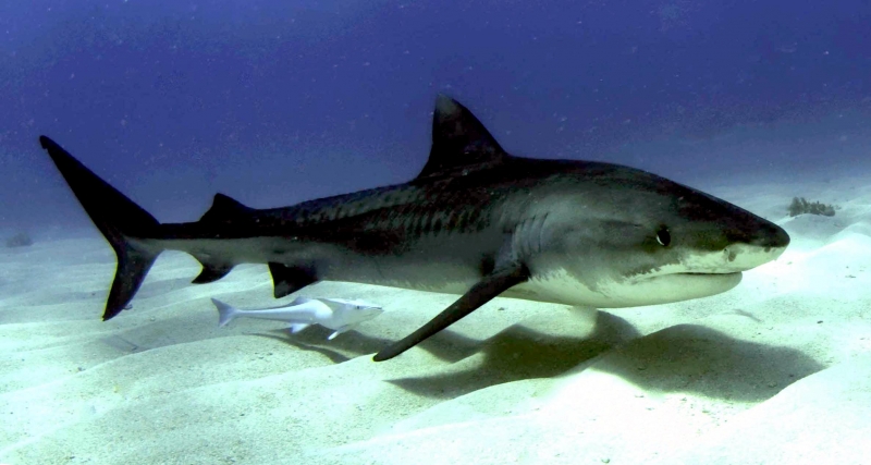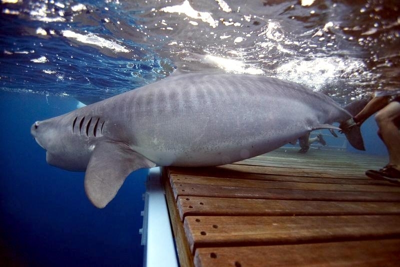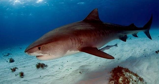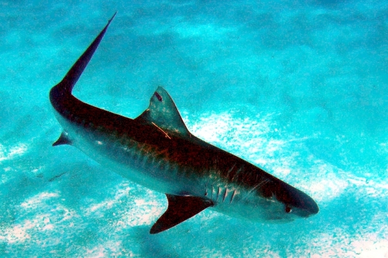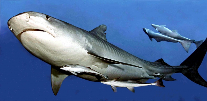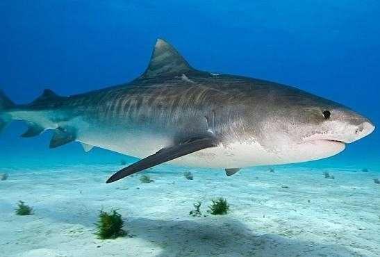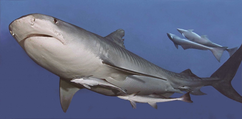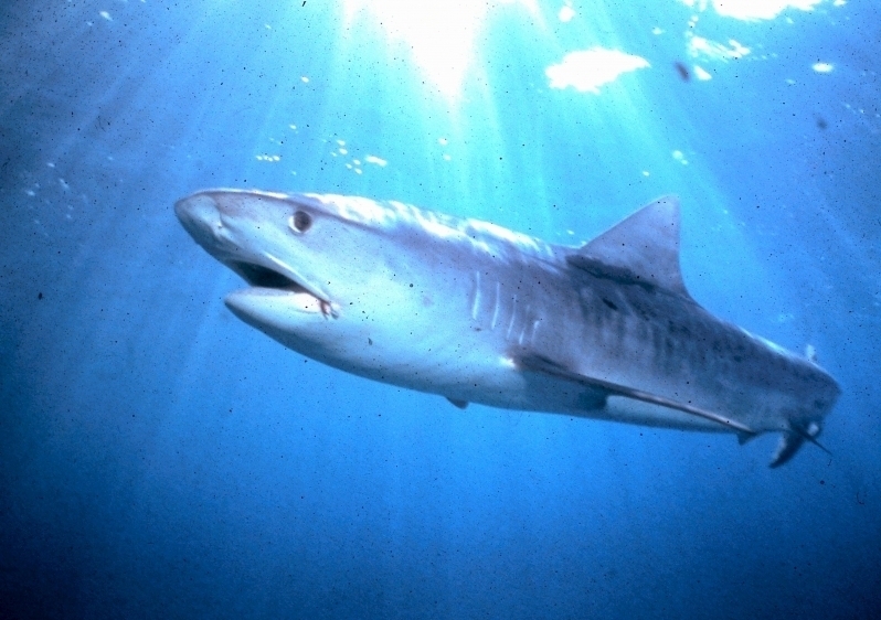 Tiger Sharks are one of the largest sharks in the world. Adults commonly reach lengths of 3.3-4.3 meters and weigh between 385-635 kilograms. Length at birth varies from 51-76 centimeters. Males reach sexual maturity at 2.3-2.9 meters, while females mature at 2.5-3.5 meters. The largest adult Tiger Sharks are believed to attain a length of over 7.4 meters and weigh over 900 kilograms. Tiger Sharks are gray in color with vertical tiger-stripe markings which usually fade or disappear in adults. They can also be identified by their characteristic sickle-shaped teeth that are similar in both the upper and lower jaw. This species is a requiem shark with a short, blunt snout, labial furrows and large head. Tiger Sharks have a slender body behind the pectoral fins and low keels on their caudal peduncle and slender and long caudal fins. Tiger Sharks are found worldwide in temperate and tropical seas. They live in coastal and pelagic waters, from the surface to depths of about 350 meters. The Tiger Shark has a wide tolerance for different marine habitats, but seems to prefer turbid waters on or adjacent to the continental and insular shelves. It is often found in river estuaries, close inshore in coral atolls and lagoons.