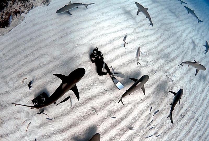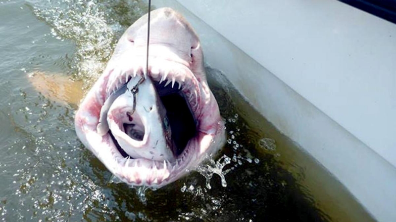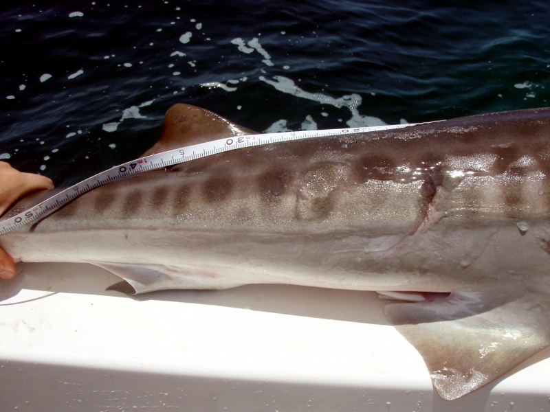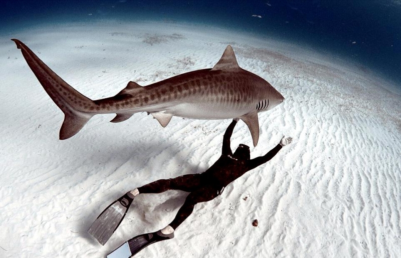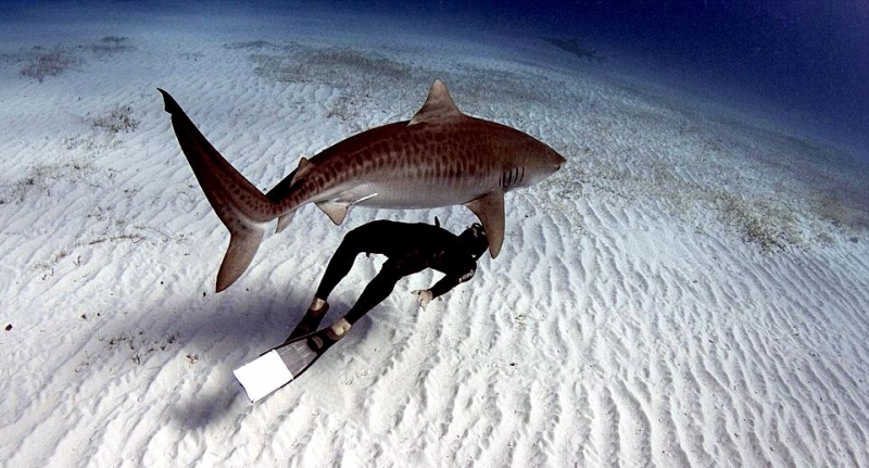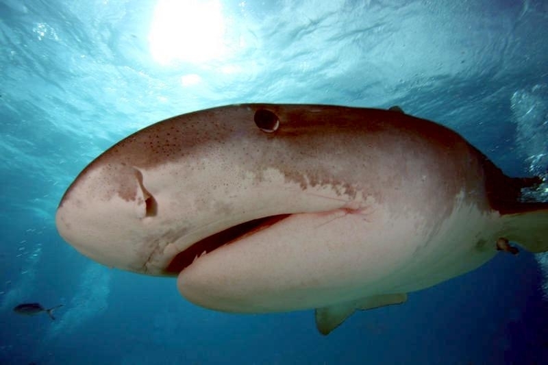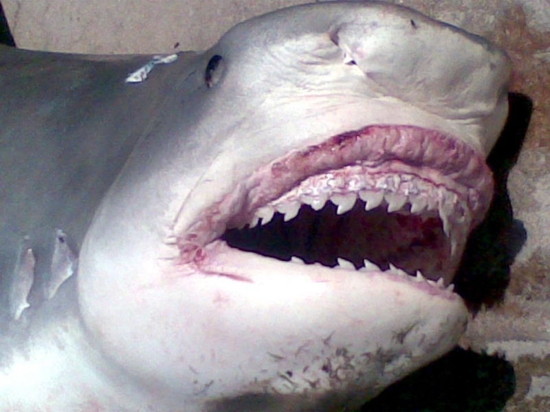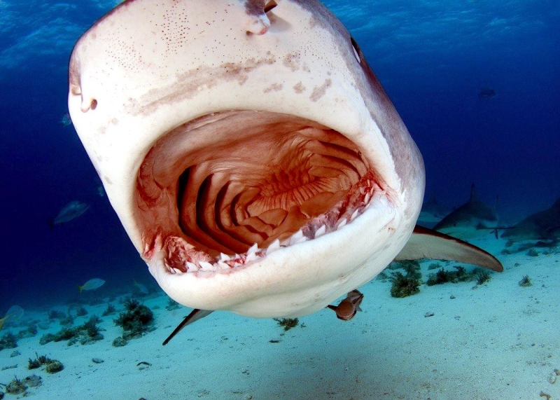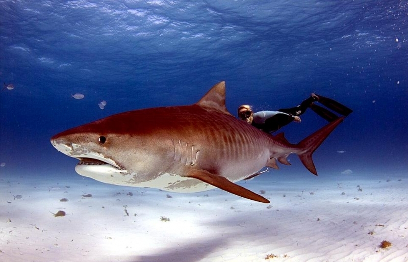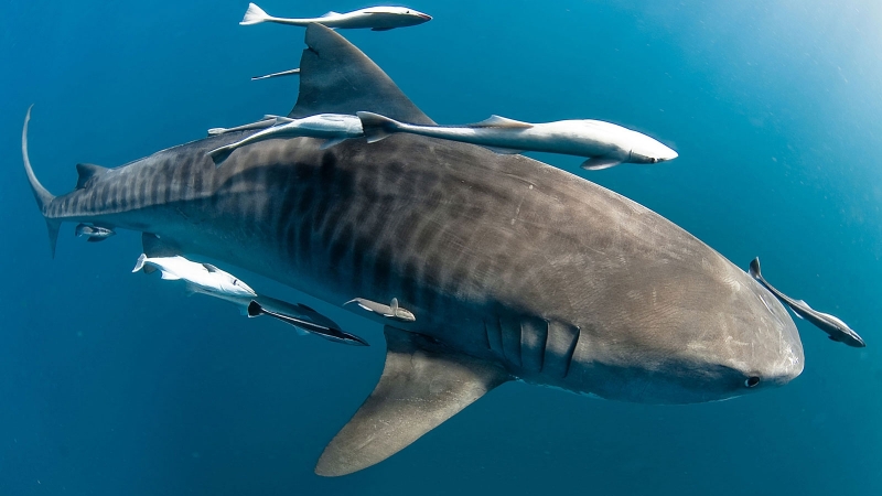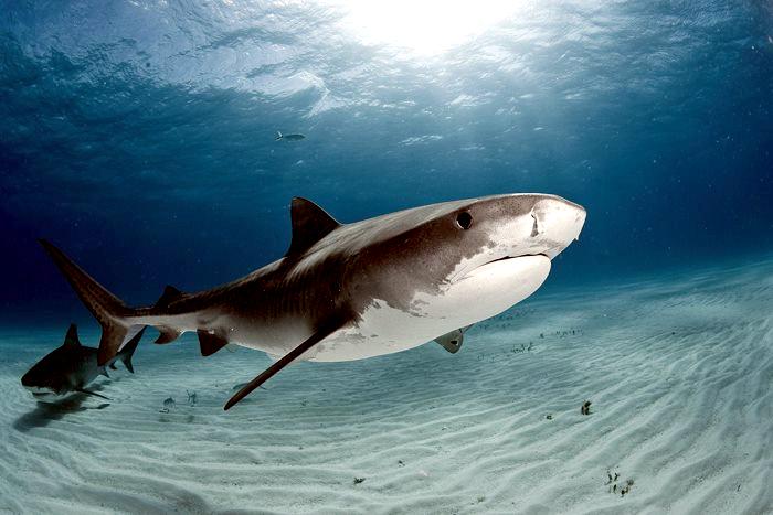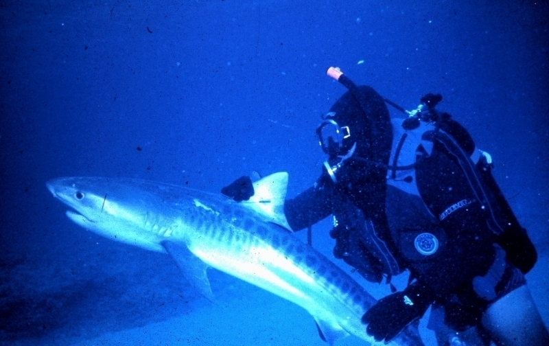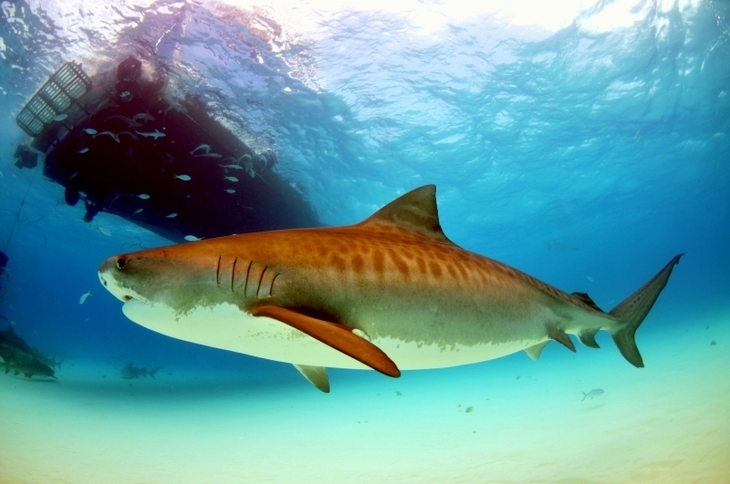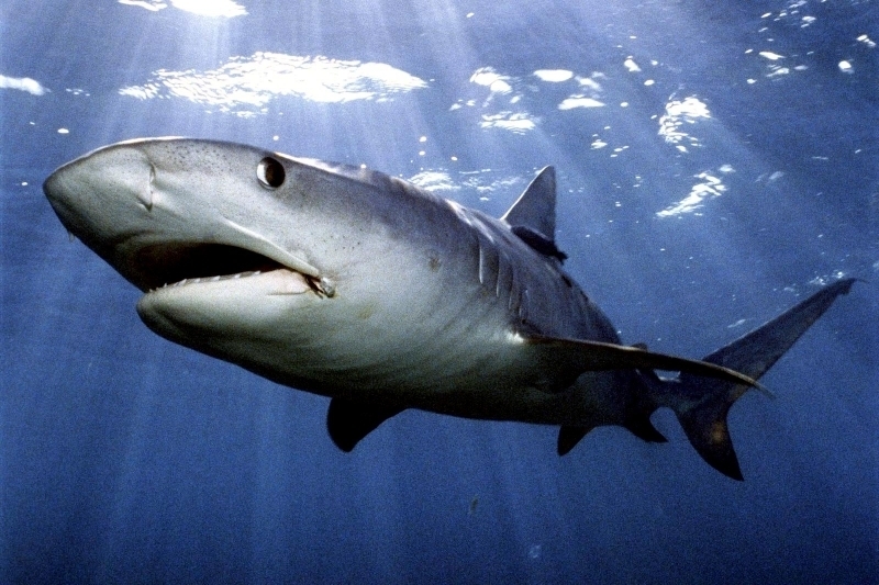 Tiger Sharks are one of the largest sharks in the world. Adults commonly reach lengths of 3.3-4.3 meters and weigh between 385-635 kilograms. Length at birth varies from 51-76 centimeters. Males reach sexual maturity at 2.3-2.9 meters, while females mature at 2.5-3.5 meters. The largest adult Tiger Sharks are believed to attain a length of over 7.4 meters and weigh over 900 kilograms. Tiger Sharks are gray in color with vertical tiger-stripe markings which usually fade or disappear in adults. They can also be identified by their characteristic sickle-shaped teeth that are similar in both the upper and lower jaw. This species is a requiem shark with a short, blunt snout, labial furrows and large head. Tiger Sharks have a slender body behind the pectoral fins and low keels on their caudal peduncle and slender and long caudal fins. Tiger Sharks are found worldwide in temperate and tropical seas. They live in coastal and pelagic waters, from the surface to depths of about 350 meters. The Tiger Shark has a wide tolerance for different marine habitats, but seems to prefer turbid waters on or adjacent to the continental and insular shelves. It is often found in river estuaries, close inshore in coral atolls and lagoons.