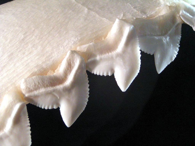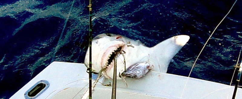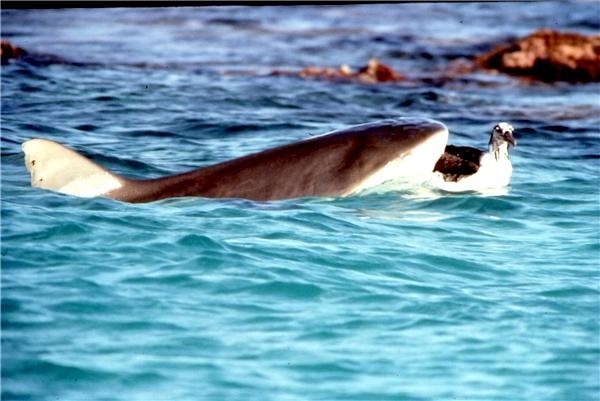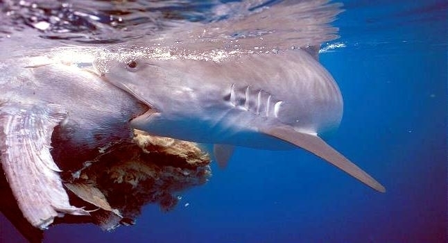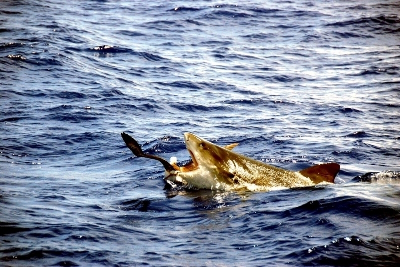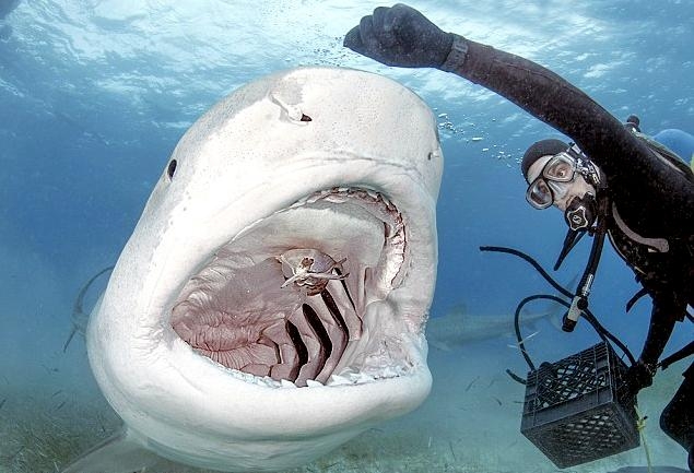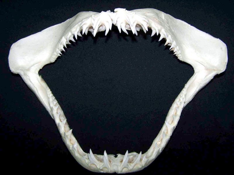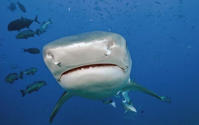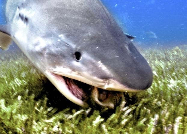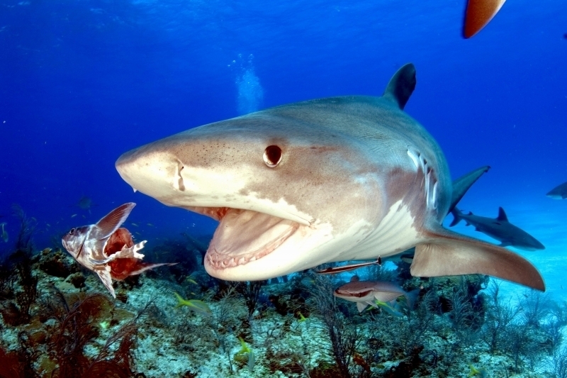 These solitary hunters are nocturnal and move inshore into shallow waters at night to feed and then move back to deeper waters in the daytime. Research by the Hawaii Institute of Marine Biology has shown that Tiger Sharks have very large home ranges. Tiger Sharks with surgically implanted ultrasonic transmitters all swam more than 16 kilometers within 1 day of their release and it took between 2 weeks and 9 months for them to revisit the area where they were released. They are likely have the widest variety in their diet out of all shark species. These sharks are predatory animals primarily known for their voracious appetites. They seem to be indiscriminate in their food selection and are known to eat fishes, other sharks, sea turtles, mollusks and seabirds. They are also known scavengers. Examination of Tiger Shark stomach contents revealed such diverse items as animal antlers and ship garbage. This wide spectrum of food selection has often been interpreted as these sharks being indiscriminate feeders, however their feeding habits may indicate a highly specialized adaptation to their biology in that they are extremely large animals and need a lot of food. Their uniquely shaped teeth are highly evolved and allow them to feed on a variety of food items, which helps prevent food shortages that might arise in more selective feeders.