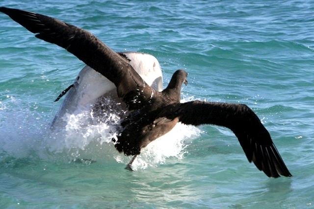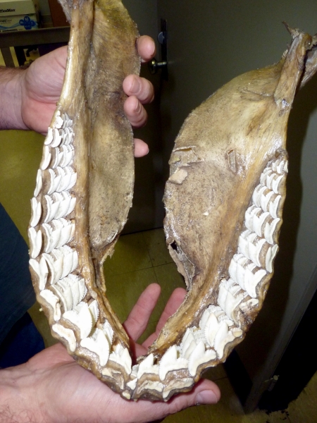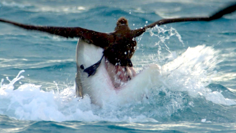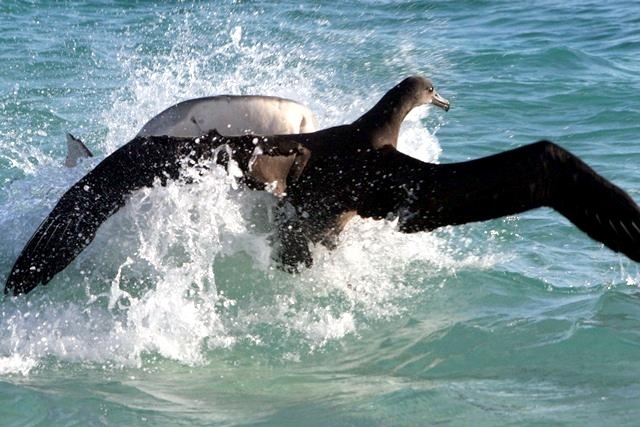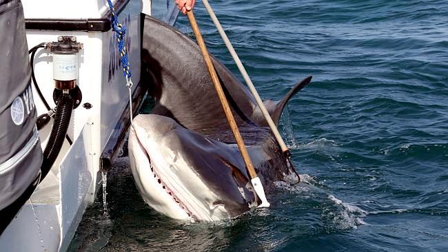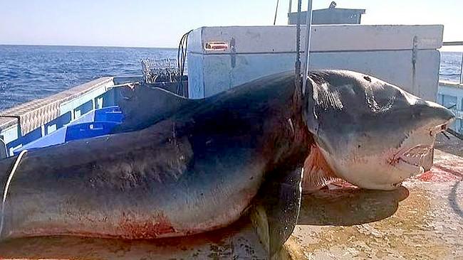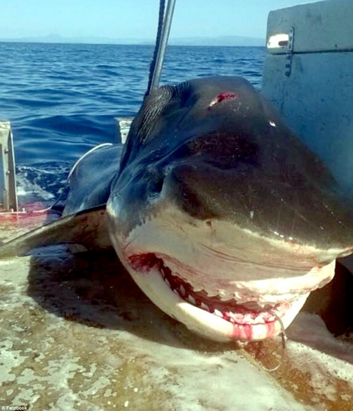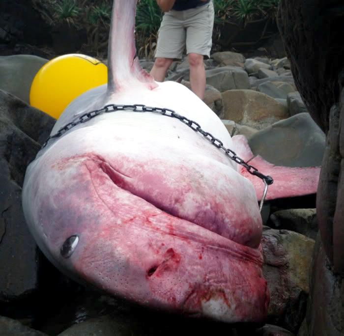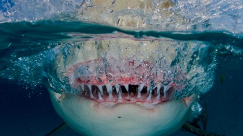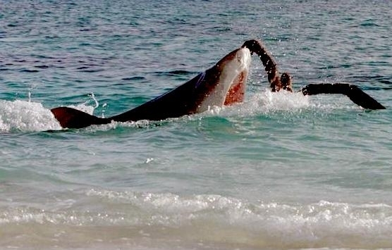 These solitary hunters are nocturnal and move inshore into shallow waters at night to feed and then move back to deeper waters in the daytime. Research by the Hawaii Institute of Marine Biology has shown that Tiger Sharks have very large home ranges. Tiger Sharks with surgically implanted ultrasonic transmitters all swam more than 16 kilometers within 1 day of their release and it took between 2 weeks and 9 months for them to revisit the area where they were released. They are likely have the widest variety in their diet out of all shark species. These sharks are predatory animals primarily known for their voracious appetites. They seem to be indiscriminate in their food selection and are known to eat fishes, other sharks, sea turtles, mollusks and seabirds. They are also known scavengers. Examination of Tiger Shark stomach contents revealed such diverse items as animal antlers and ship garbage. This wide spectrum of food selection has often been interpreted as these sharks being indiscriminate feeders, however their feeding habits may indicate a highly specialized adaptation to their biology in that they are extremely large animals and need a lot of food. Their uniquely shaped teeth are highly evolved and allow them to feed on a variety of food items, which helps prevent food shortages that might arise in more selective feeders.