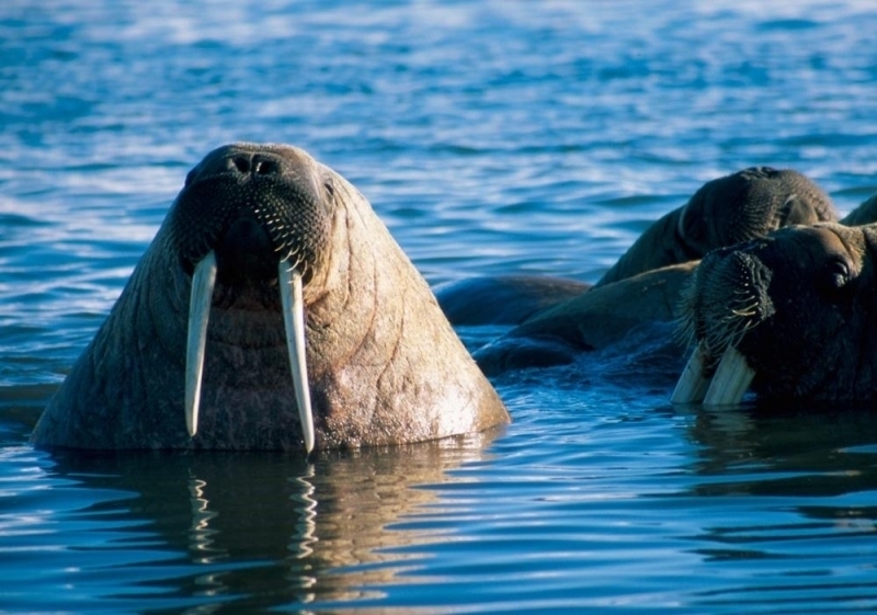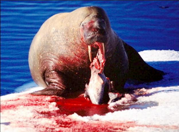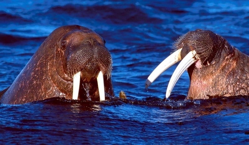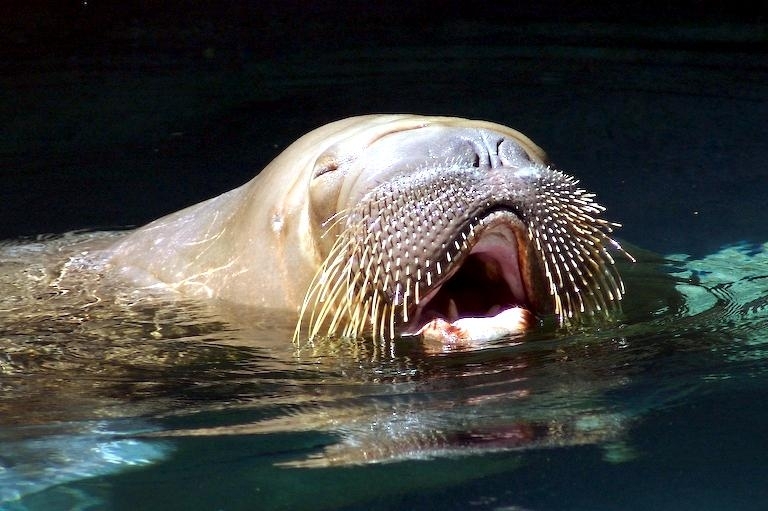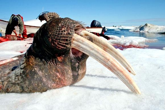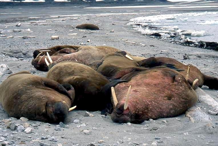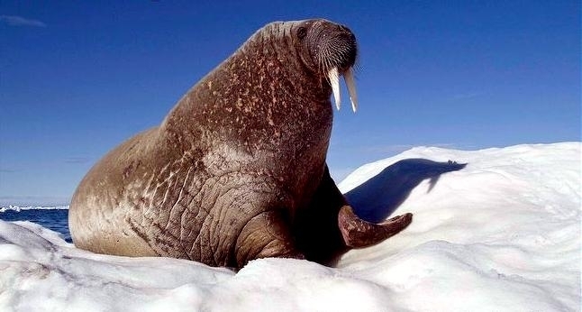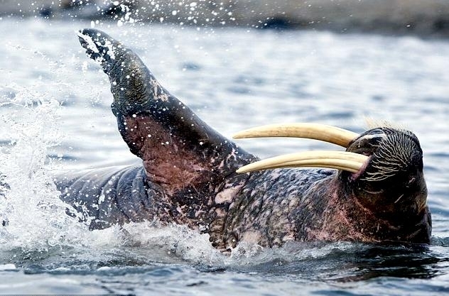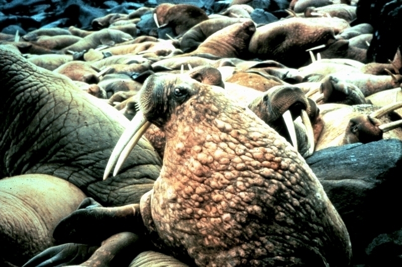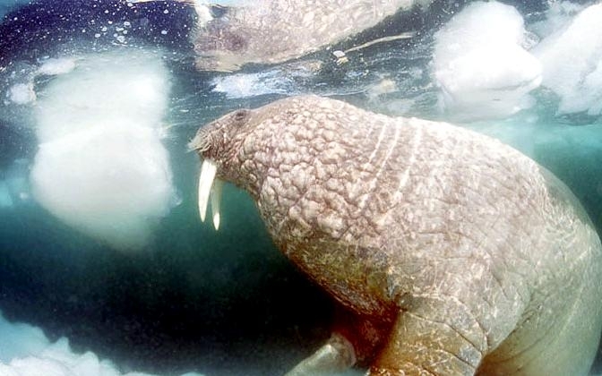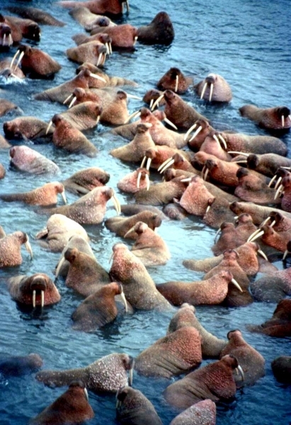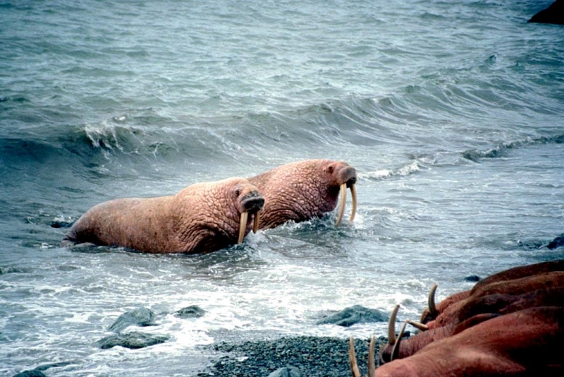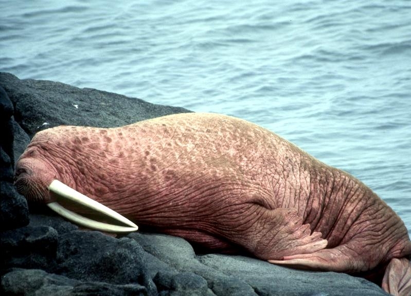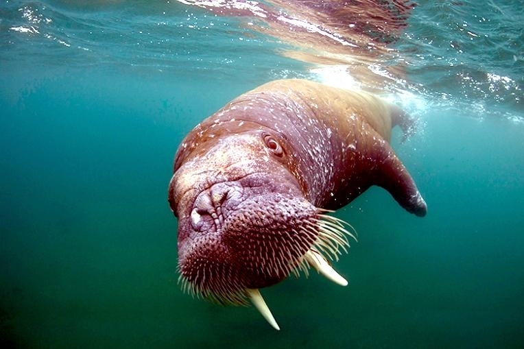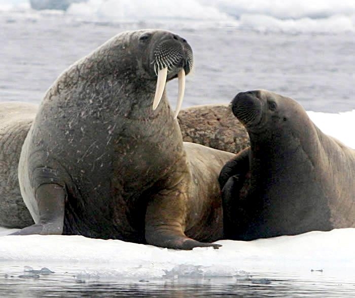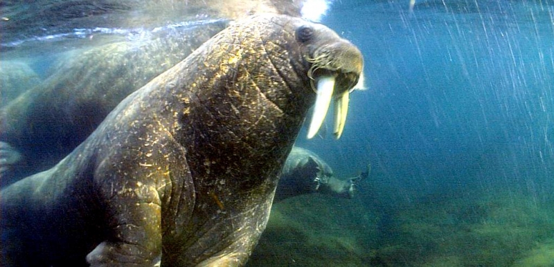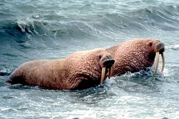 Due to their diet of small organisms, large quantities are required to sustain them. Each time a Walrus dives down to eat, they can consume up to 60 clams. Their dives for food usually last 5 to 20 minutes. Walruses can dive to depths of approximately 70 meters. Adults require 25 kilograms of small benthic organisms per day. Walruses occasionally eat bigger animals such as seals and some seabirds. Walrus predators include Killer Whales and Polar Bears. Adults use their giant tusks as a weapon to defend themselves. The young Walruses are more susceptible to predation. Humans are their main predator. Walruses forage mainly on mollusks and other benthic organisms. Sometimes parasites can get inside their intestines and the intestinal lining. In extreme cases this can cause death but usually it just causes pain, sickness and organ damage. The parasite Toxoplasma gondii, is found in Walruses and is acquired when eating bivalves. This parasite can cause Toxoplasmosis and results in death. Brucellosis causing parasites result in reproductive problems for Walruses. This can lead to stillbirths and can result in death to the parent as well. Walruses are extremely important to humans. Humans hunt them and use them for oil, ivory and their hides. Many centuries ago, the natives of Alaska, Canada and Russia hunted them for their meat & bones which were used to make tools. Population sizes of Walruses decreased greatly in the 18th century due to over-hunting. Through the years, governments from various countries have put restrictions on Walrus hunting. This has allowed the populations to rebound but they have never fully recovered. There are no known adverse effects of Walruses on humans.