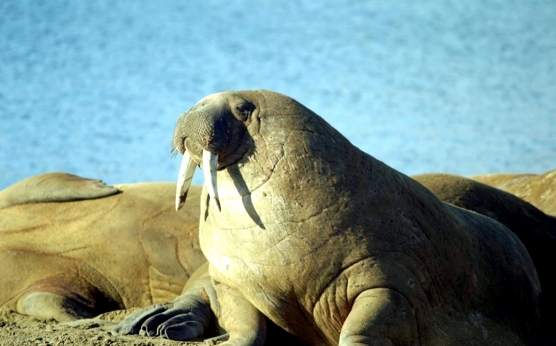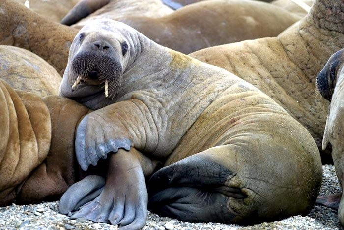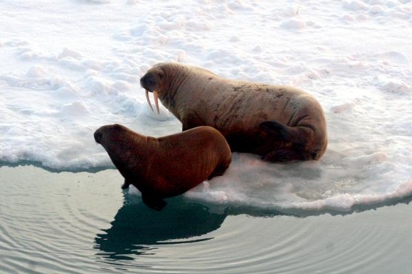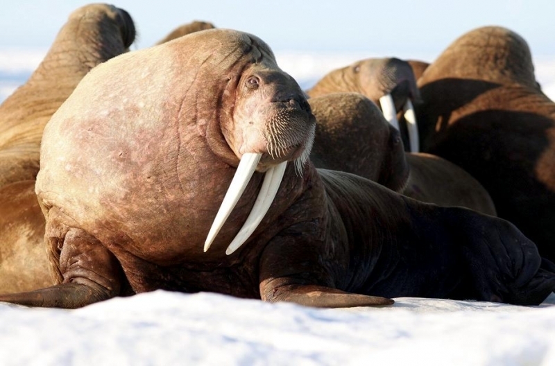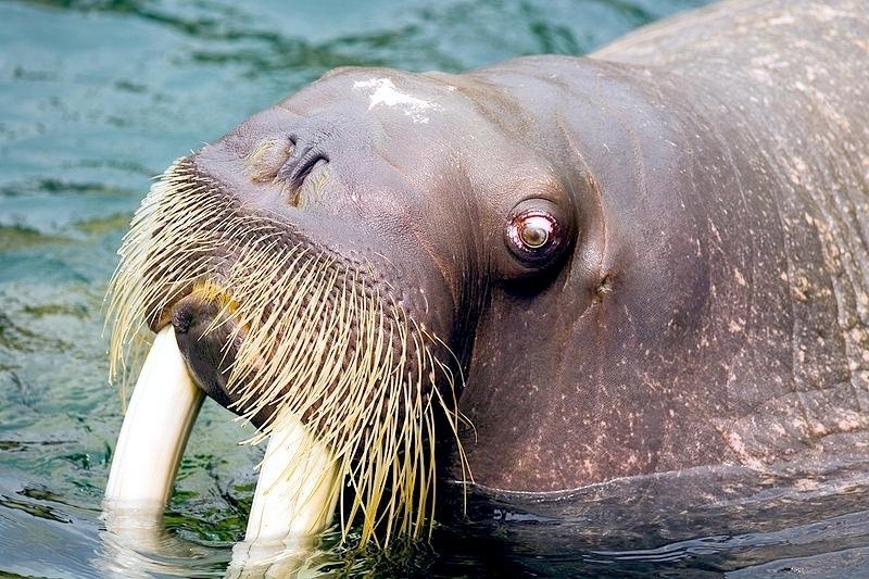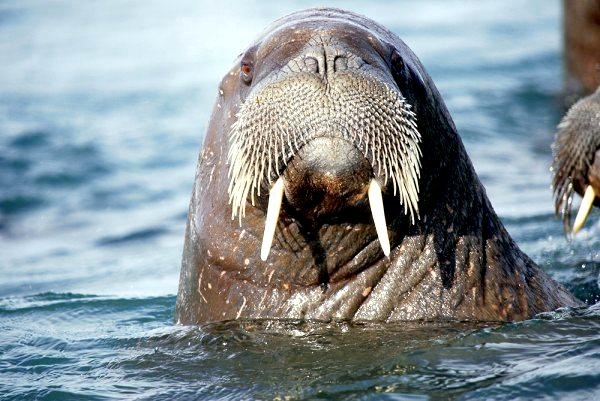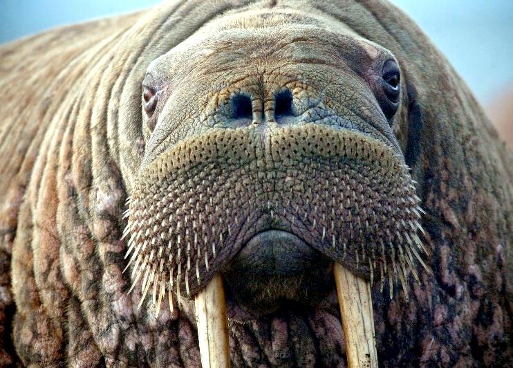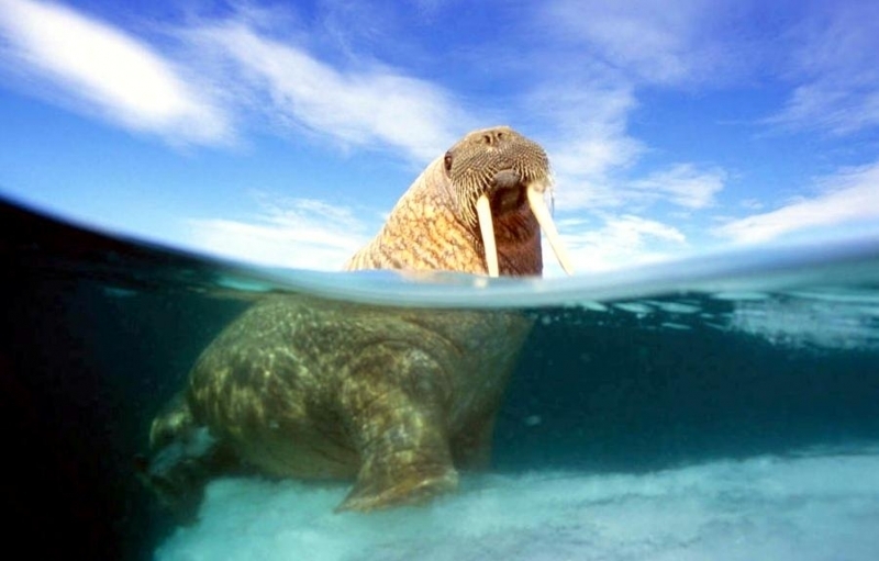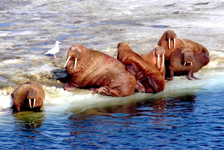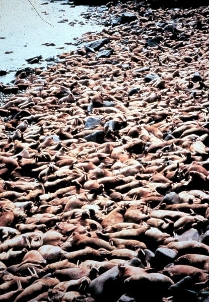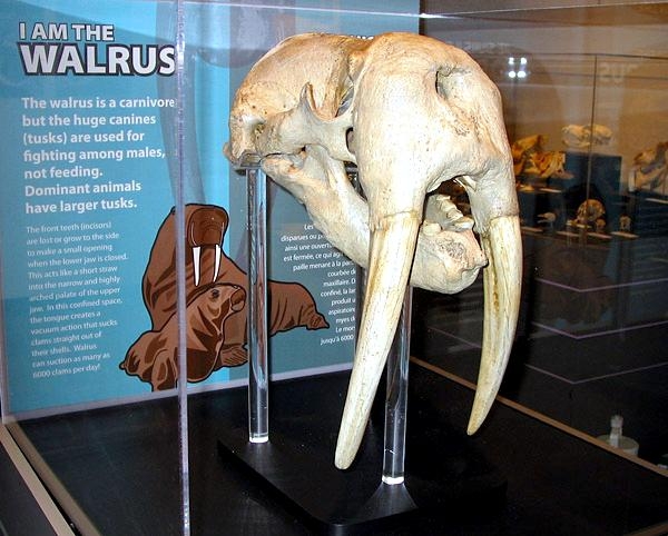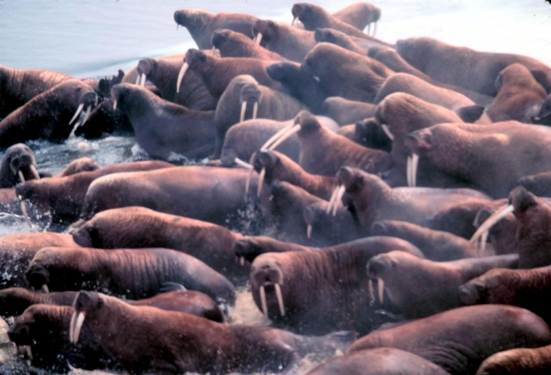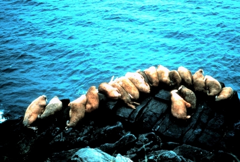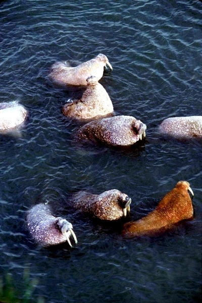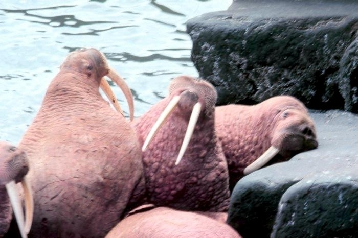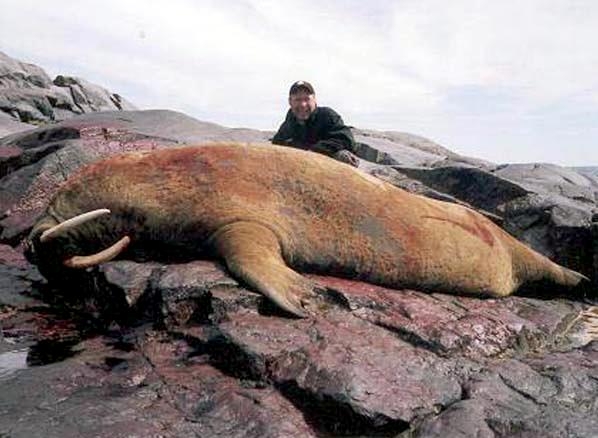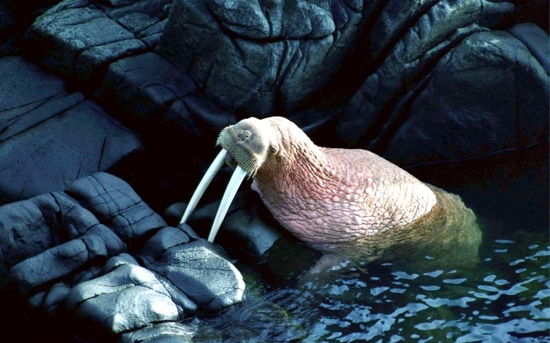 Due to their diet of small organisms, large quantities are required to sustain them. Each time a Walrus dives down to eat, they can consume up to 60 clams. Their dives for food usually last 5 to 20 minutes. Walruses can dive to depths of approximately 70 meters. Adults require 25 kilograms of small benthic organisms per day. Walruses occasionally eat bigger animals such as seals and some seabirds. Walrus predators include Killer Whales and Polar Bears. Adults use their giant tusks as a weapon to defend themselves. The young Walruses are more susceptible to predation. Humans are their main predator. Walruses forage mainly on mollusks and other benthic organisms. Sometimes parasites can get inside their intestines and the intestinal lining. In extreme cases this can cause death but usually it just causes pain, sickness and organ damage. The parasite Toxoplasma gondii, is found in Walruses and is acquired when eating bivalves. This parasite can cause Toxoplasmosis and results in death. Brucellosis causing parasites result in reproductive problems for Walruses. This can lead to stillbirths and can result in death to the parent as well. Walruses are extremely important to humans. Humans hunt them and use them for oil, ivory and their hides. Many centuries ago, the natives of Alaska, Canada and Russia hunted them for their meat & bones which were used to make tools. Population sizes of Walruses decreased greatly in the 18th century due to over-hunting. Through the years, governments from various countries have put restrictions on Walrus hunting. This has allowed the populations to rebound but they have never fully recovered. There are no known adverse effects of Walruses on humans.