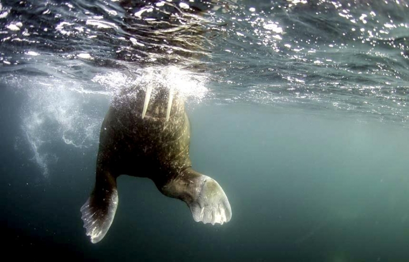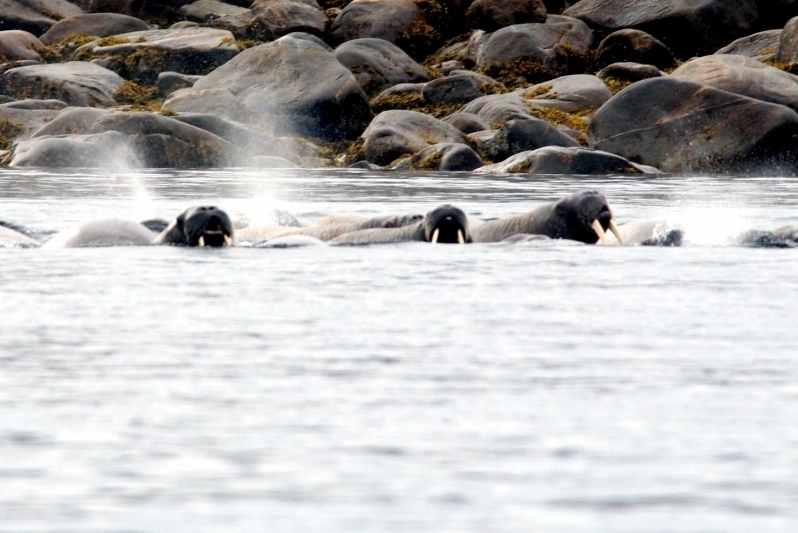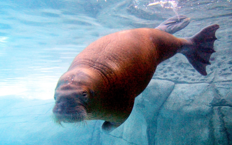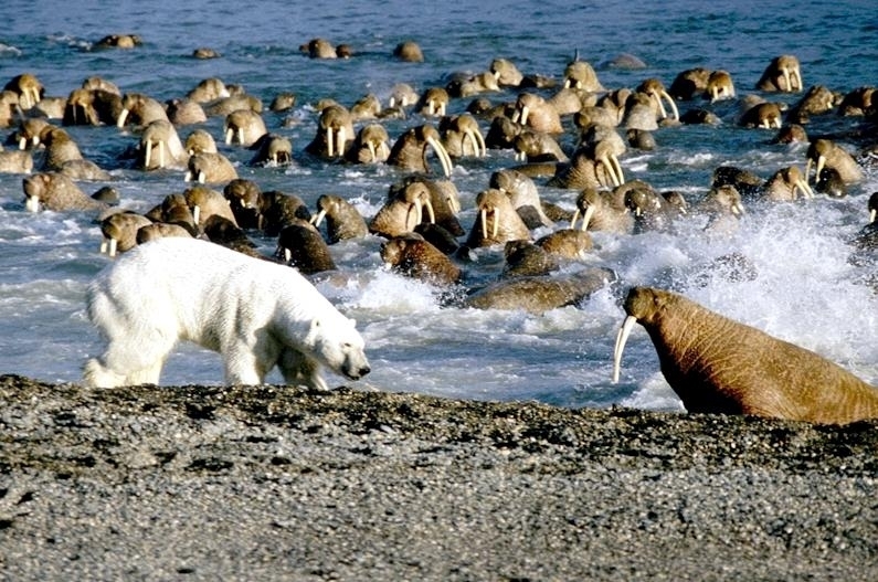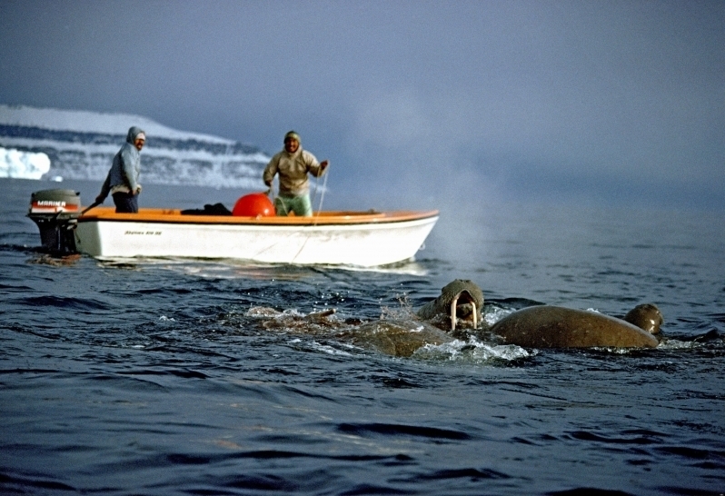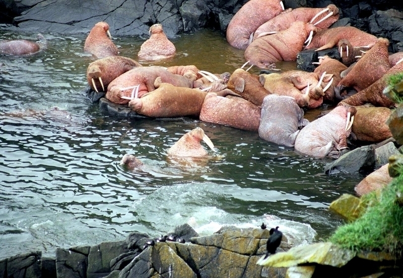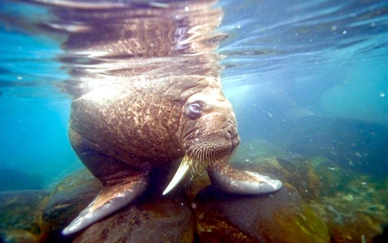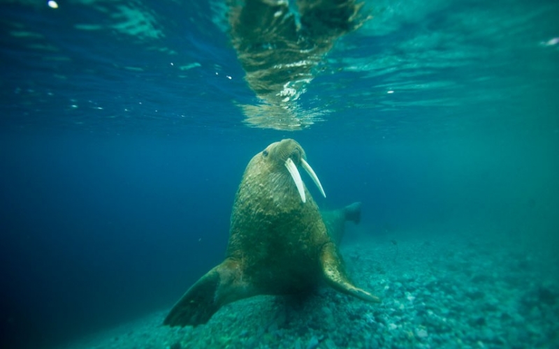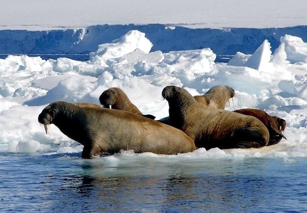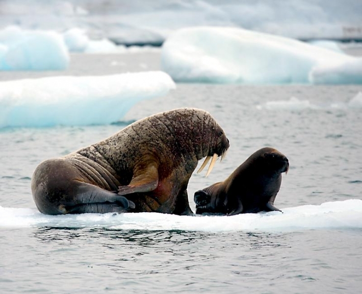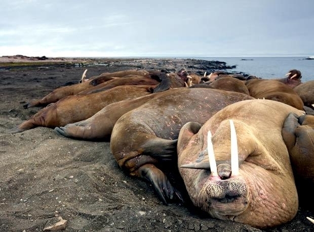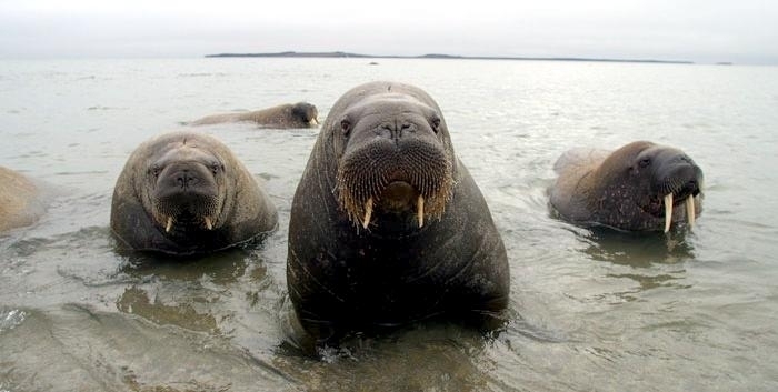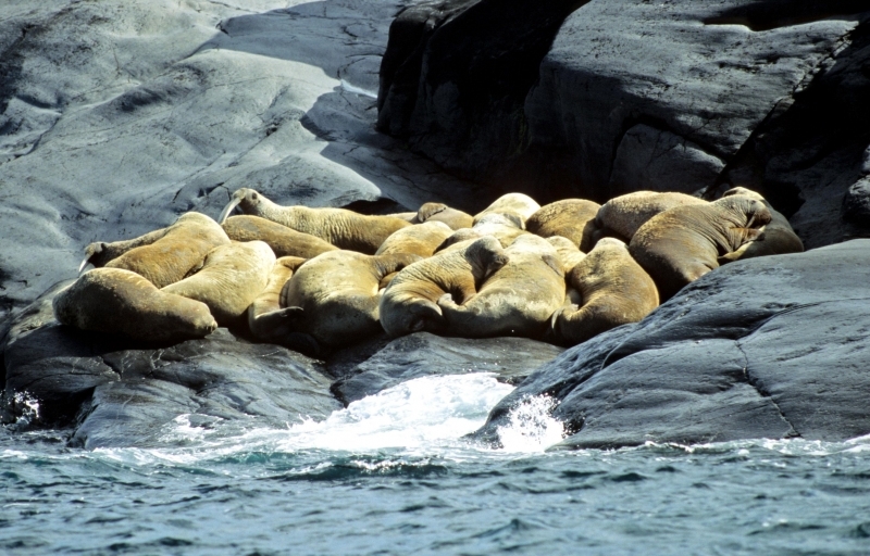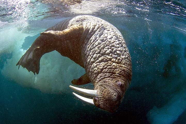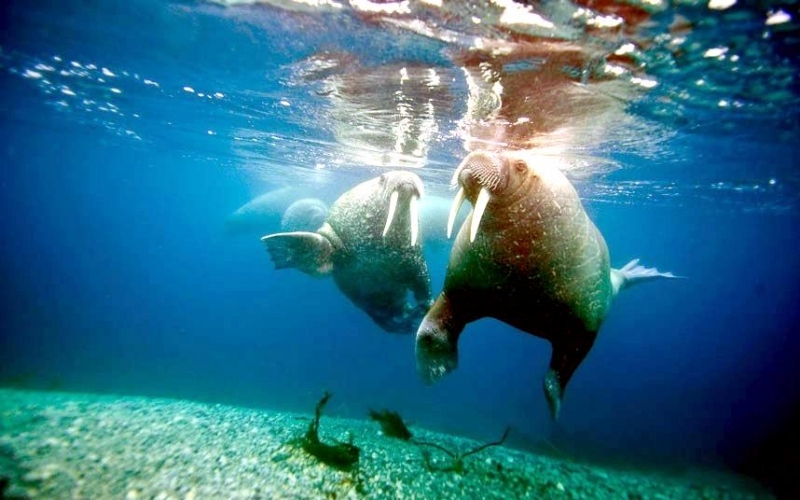 Due to their diet of small organisms, large quantities are required to sustain them. Each time a Walrus dives down to eat, they can consume up to 60 clams. Their dives for food usually last 5 to 20 minutes. Walruses can dive to depths of approximately 70 meters. Adults require 25 kilograms of small benthic organisms per day. Walruses occasionally eat bigger animals such as seals and some seabirds. Walrus predators include Killer Whales and Polar Bears. Adults use their giant tusks as a weapon to defend themselves. The young Walruses are more susceptible to predation. Humans are their main predator. Walruses forage mainly on mollusks and other benthic organisms. Sometimes parasites can get inside their intestines and the intestinal lining. In extreme cases this can cause death but usually it just causes pain, sickness and organ damage. The parasite Toxoplasma gondii, is found in Walruses and is acquired when eating bivalves. This parasite can cause Toxoplasmosis and results in death. Brucellosis causing parasites result in reproductive problems for Walruses. This can lead to stillbirths and can result in death to the parent as well. Walruses are extremely important to humans. Humans hunt them and use them for oil, ivory and their hides. Many centuries ago, the natives of Alaska, Canada and Russia hunted them for their meat & bones which were used to make tools. Population sizes of Walruses decreased greatly in the 18th century due to over-hunting. Through the years, governments from various countries have put restrictions on Walrus hunting. This has allowed the populations to rebound but they have never fully recovered. There are no known adverse effects of Walruses on humans.