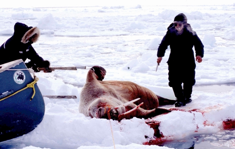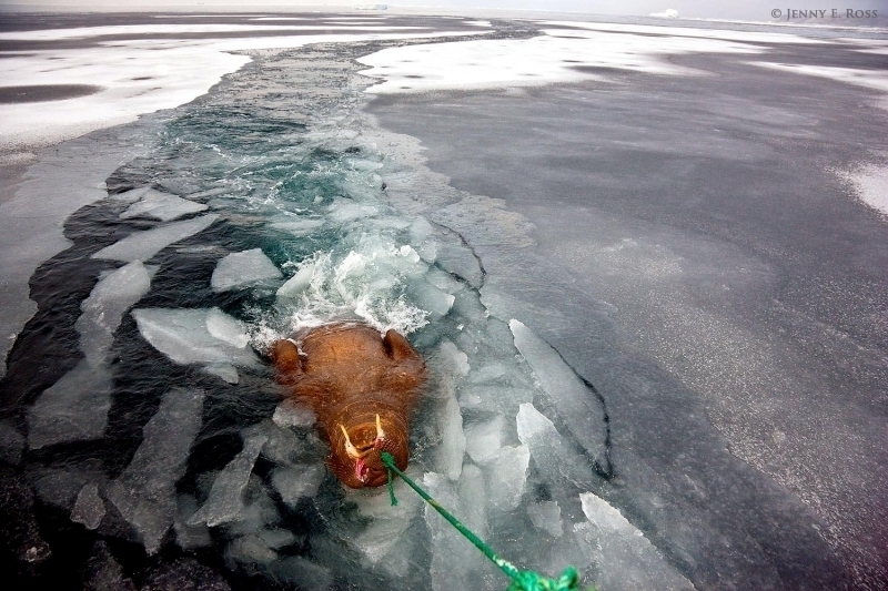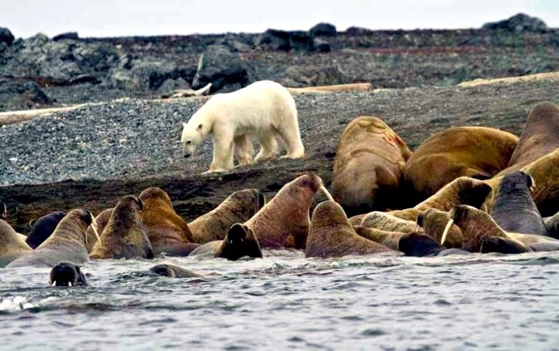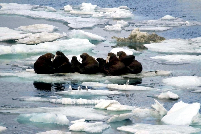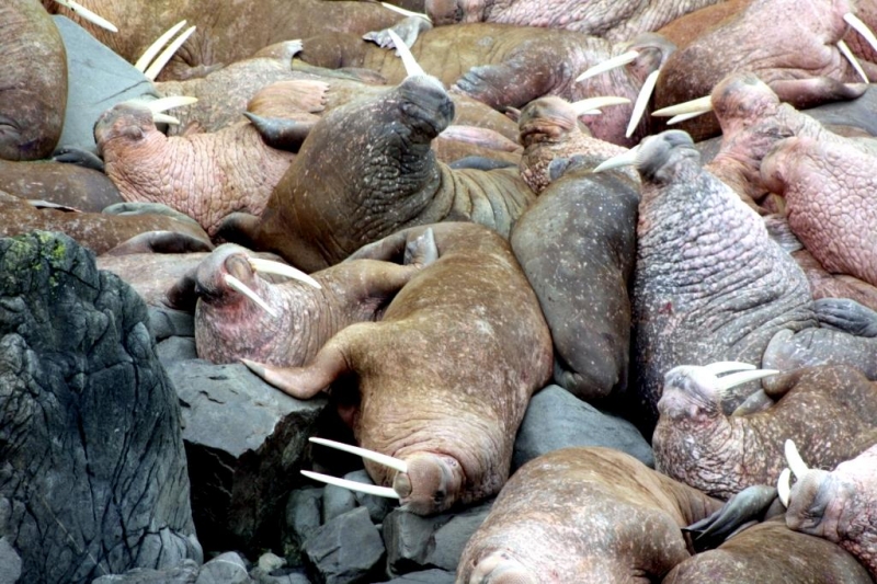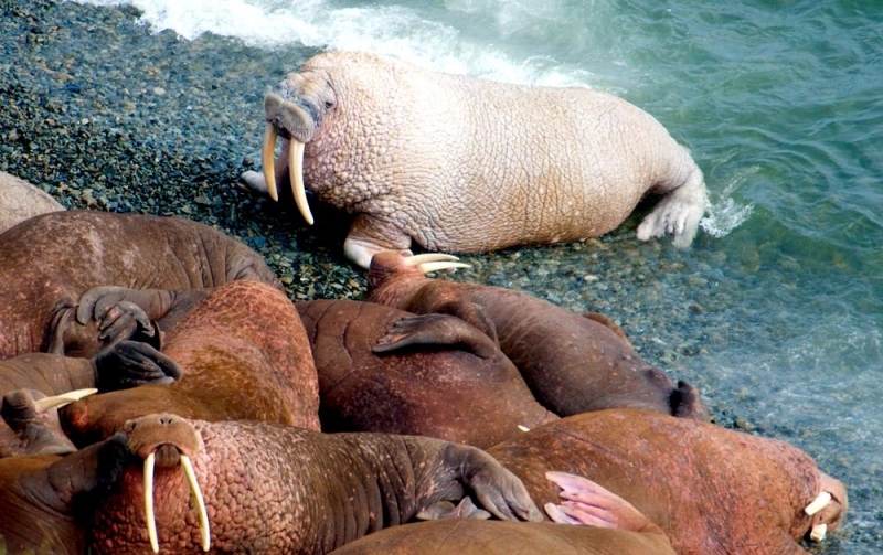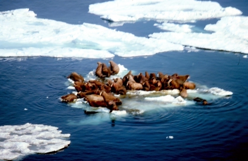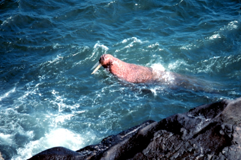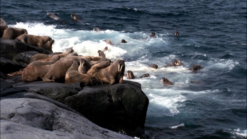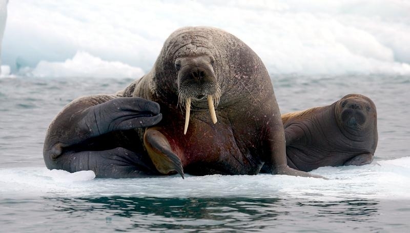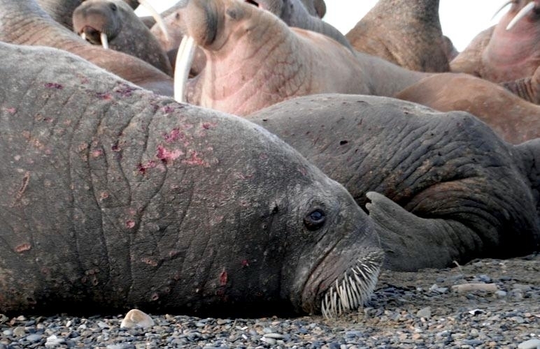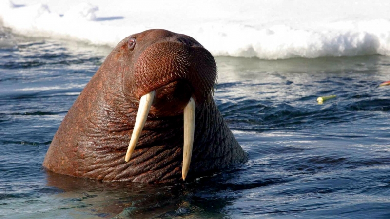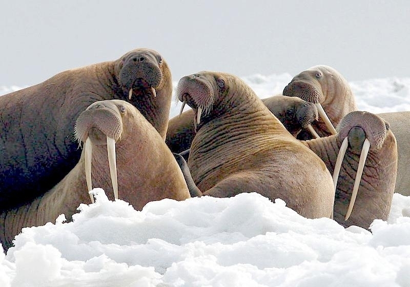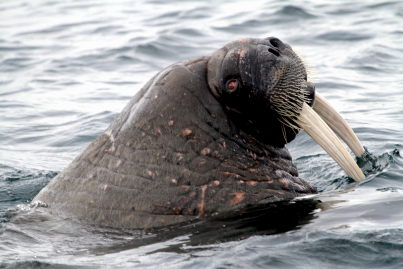 Due to their diet of small organisms, large quantities are required to sustain them. Each time a Walrus dives down to eat, they can consume up to 60 clams. Their dives for food usually last 5 to 20 minutes. Walruses can dive to depths of approximately 70 meters. Adults require 25 kilograms of small benthic organisms per day. Walruses occasionally eat bigger animals such as seals and some seabirds. Walrus predators include Killer Whales and Polar Bears. Adults use their giant tusks as a weapon to defend themselves. The young Walruses are more susceptible to predation. Humans are their main predator. Walruses forage mainly on mollusks and other benthic organisms. Sometimes parasites can get inside their intestines and the intestinal lining. In extreme cases this can cause death but usually it just causes pain, sickness and organ damage. The parasite Toxoplasma gondii, is found in Walruses and is acquired when eating bivalves. This parasite can cause Toxoplasmosis and results in death. Brucellosis causing parasites result in reproductive problems for Walruses. This can lead to stillbirths and can result in death to the parent as well. Walruses are extremely important to humans. Humans hunt them and use them for oil, ivory and their hides. Many centuries ago, the natives of Alaska, Canada and Russia hunted them for their meat & bones which were used to make tools. Population sizes of Walruses decreased greatly in the 18th century due to over-hunting. Through the years, governments from various countries have put restrictions on Walrus hunting. This has allowed the populations to rebound but they have never fully recovered. There are no known adverse effects of Walruses on humans.