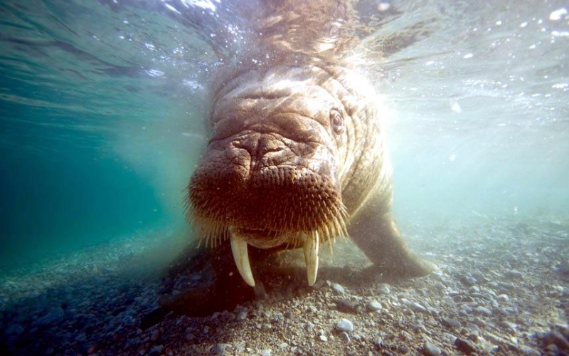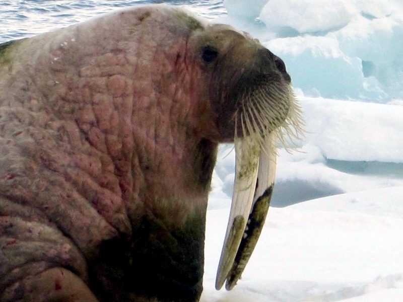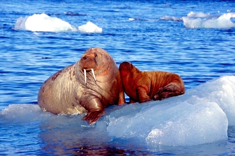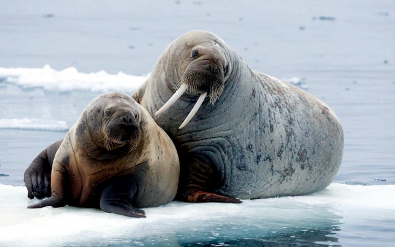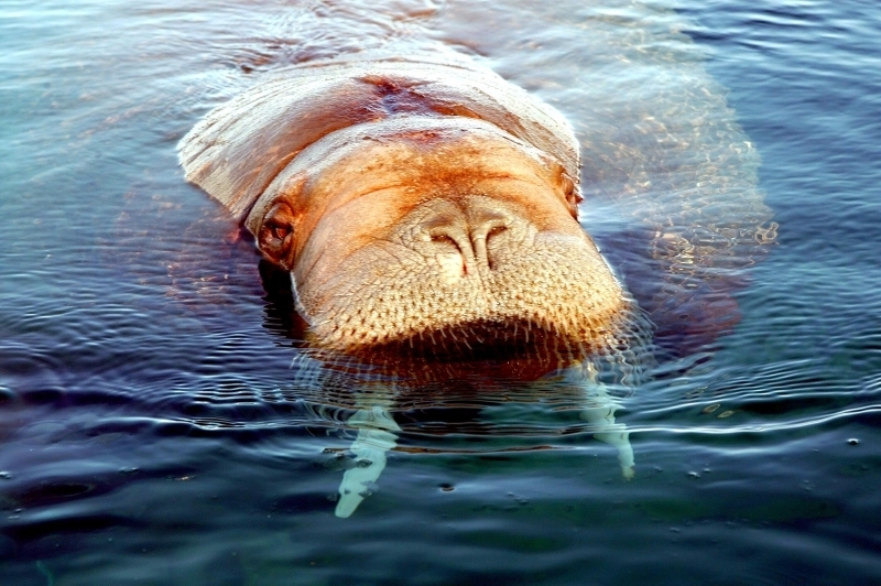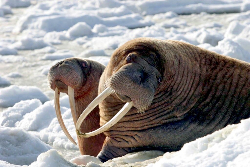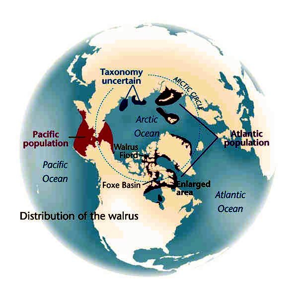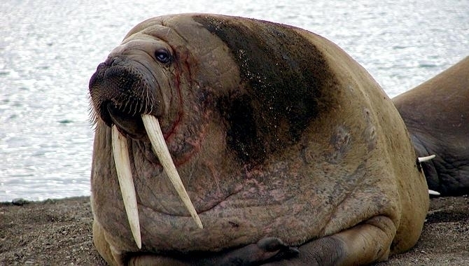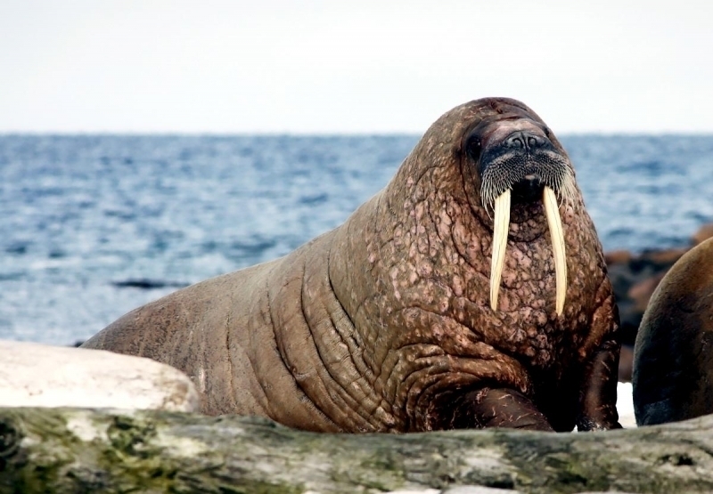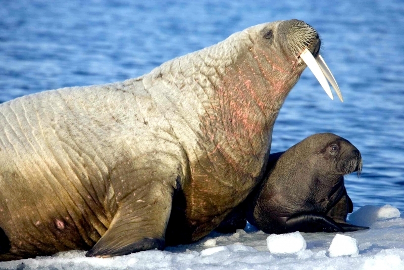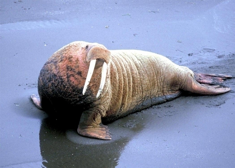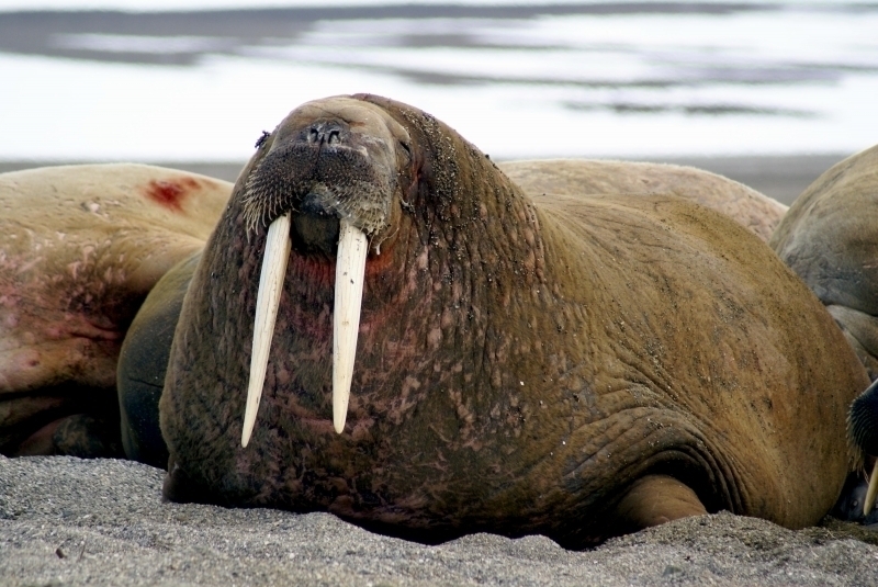 Walruses are only found in the Arctic regions of the world. Walruses inhabit areas in the Arctic that are largely made up of ice. Walruses prefer areas with shallow water so they can easily access food. This slow-moving marine mammal spends the majority of its time in or around water. The origin of the word Walrus is thought by to derive from a Germanic language and it has been attributed largely to either the Dutch language or Old Norse. The first part derives from the Dutch word walvis meaning “whale”. The second part comes from the Old Norse word for ‘horse’ hrossvalr and is thought to have been passed in an inverted form to both Dutch and the dialects of northern Germany as walros and Walross. Females spend more time on ice opposed to the males, who spend more of their time on sand or boulder beaches. Walruses migrate north during the summer and south in the winter. The migrations ensure that the Walruses can be where the most optimal ice is found. Optimal is defined as relatively thin ice but thick enough to hold the enormous weight of their bodies. Walruses are one of the largest pinnipeds. The Pacific Walrus tend to have a larger body mass than the Atlantic Walrus. This animal is known for their massive tusks, which are really just enlarged canine teeth. These tusks can break through 20 centimeters of ice. They also assist Walruses in climbing out of the water and onto the ice. The tusks can be used for the Walruses to defend themselves from larger predators and are also a way to establish dominance hierarchy among Walruses. Tusks can grow to a length of 90 centimeters but the average size is roughly 50 centimeters. Walruses have thick skin that ranges from a light gray to a yellowish brown color. Walrus pups skin color differs from the adult because they are usually solid grey, while adults can range in colors. The skin thickness varies across the body but is usually 2 to 4 centimeters thick. The layer of blubber underneath the skin can be as thick as 25.4 centimeters. Walruses have short fur in most areas of their bodies except their appendages. Walruses have whiskers to help them feel around on the ocean floor. They have relatively small eyes because they rely mainly on sense of touch to find food. They have short front flippers not only to swim but also to assist them on land. It uses its hind flippers as a motor to move its large body through the waters with the help of the front flippers to navigate which direction it will go in. Male have greater mass than females, weighing up to 1,200-1,500 kilograms and can be as long as 320 centimeters. Females of the same age can weigh 600-850 kilograms and grow to a length of 270 centimeters. Males also have longer & thicker tusks than females and thicker skin as well. Walruses are polygamous, meaning that a single male usually mates with many females.