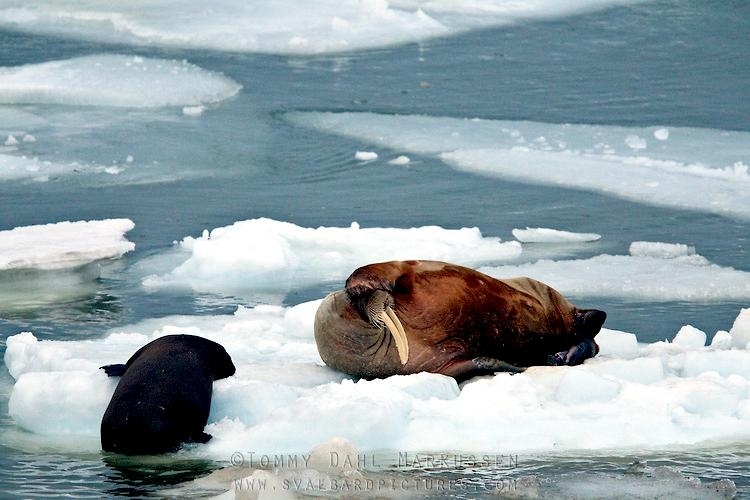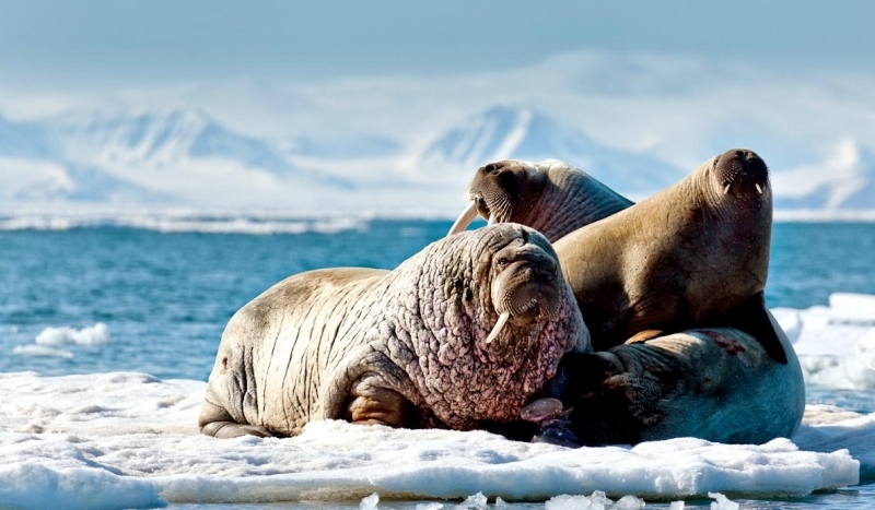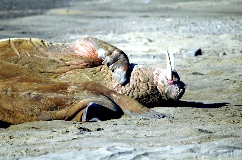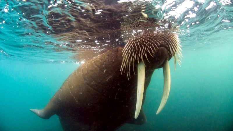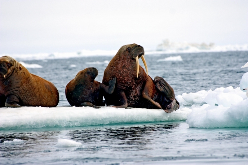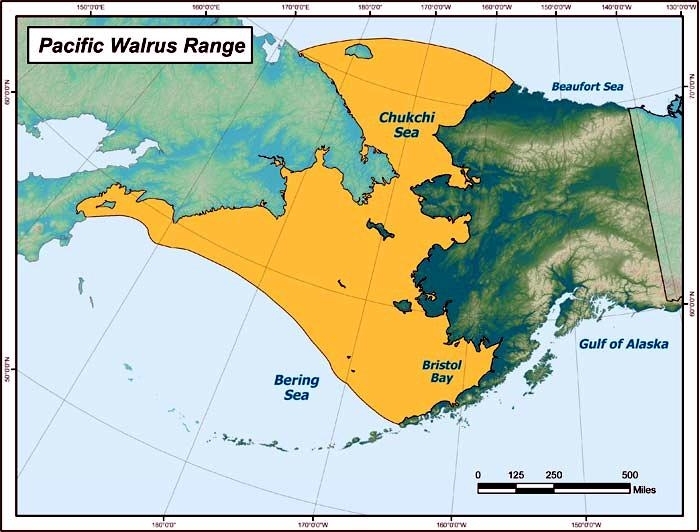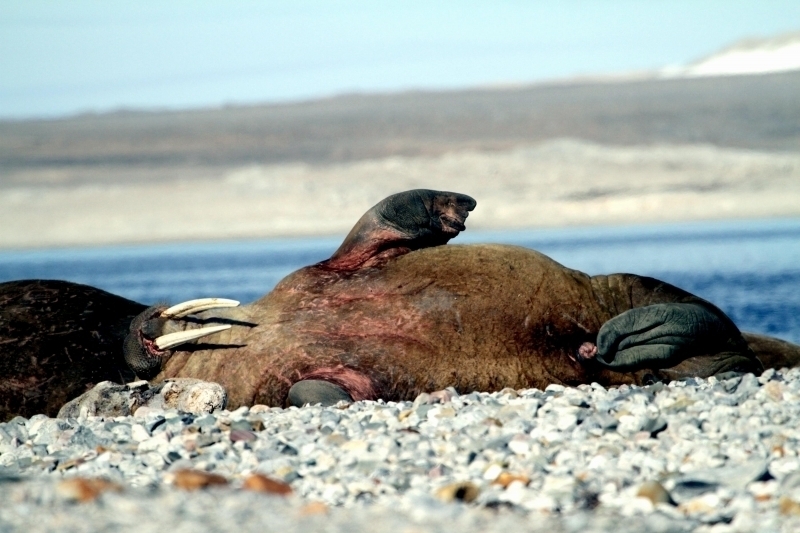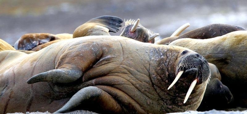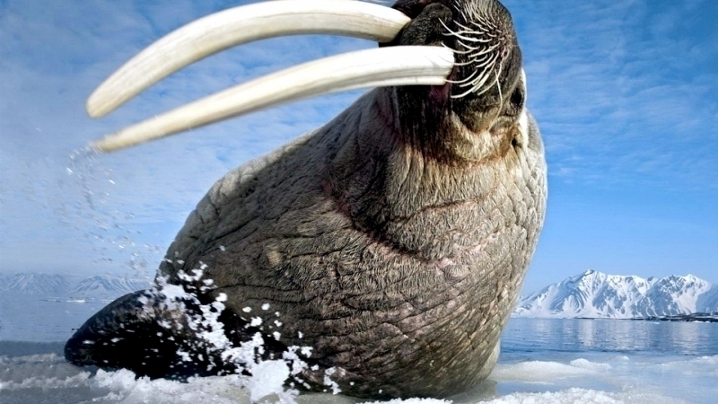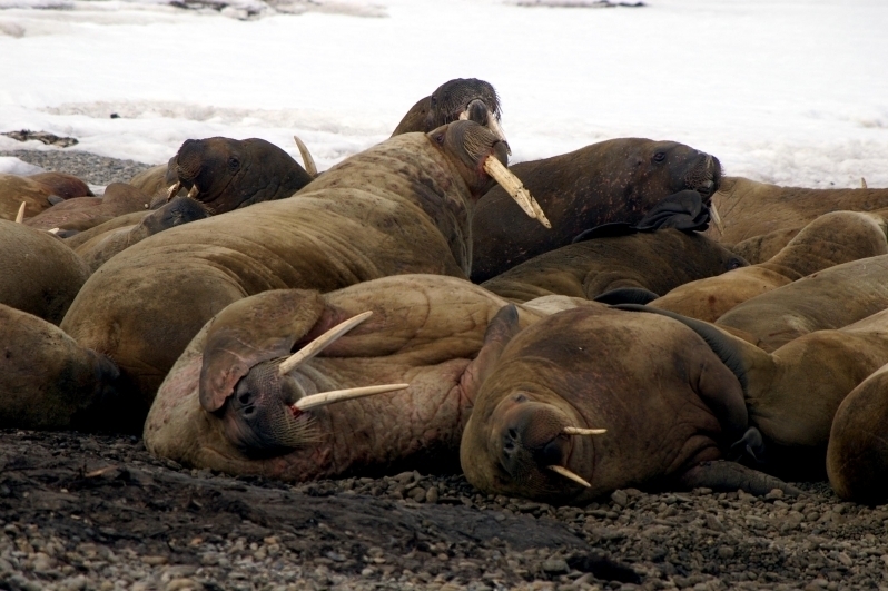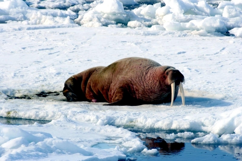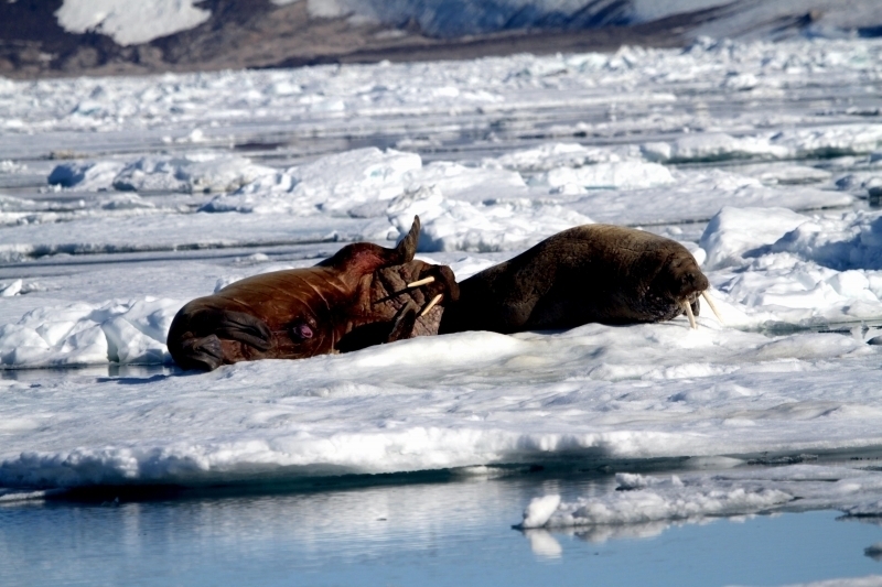 Walruses are only found in the Arctic regions of the world. Walruses inhabit areas in the Arctic that are largely made up of ice. Walruses prefer areas with shallow water so they can easily access food. This slow-moving marine mammal spends the majority of its time in or around water. The origin of the word Walrus is thought by to derive from a Germanic language and it has been attributed largely to either the Dutch language or Old Norse. The first part derives from the Dutch word walvis meaning “whale”. The second part comes from the Old Norse word for ‘horse’ hrossvalr and is thought to have been passed in an inverted form to both Dutch and the dialects of northern Germany as walros and Walross. Females spend more time on ice opposed to the males, who spend more of their time on sand or boulder beaches. Walruses migrate north during the summer and south in the winter. The migrations ensure that the Walruses can be where the most optimal ice is found. Optimal is defined as relatively thin ice but thick enough to hold the enormous weight of their bodies. Walruses are one of the largest pinnipeds. The Pacific Walrus tend to have a larger body mass than the Atlantic Walrus. This animal is known for their massive tusks, which are really just enlarged canine teeth. These tusks can break through 20 centimeters of ice. They also assist Walruses in climbing out of the water and onto the ice. The tusks can be used for the Walruses to defend themselves from larger predators and are also a way to establish dominance hierarchy among Walruses. Tusks can grow to a length of 90 centimeters but the average size is roughly 50 centimeters. Walruses have thick skin that ranges from a light gray to a yellowish brown color. Walrus pups skin color differs from the adult because they are usually solid grey, while adults can range in colors. The skin thickness varies across the body but is usually 2 to 4 centimeters thick. The layer of blubber underneath the skin can be as thick as 25.4 centimeters. Walruses have short fur in most areas of their bodies except their appendages. Walruses have whiskers to help them feel around on the ocean floor. They have relatively small eyes because they rely mainly on sense of touch to find food. They have short front flippers not only to swim but also to assist them on land. It uses its hind flippers as a motor to move its large body through the waters with the help of the front flippers to navigate which direction it will go in. Male have greater mass than females, weighing up to 1,200-1,500 kilograms and can be as long as 320 centimeters. Females of the same age can weigh 600-850 kilograms and grow to a length of 270 centimeters. Males also have longer & thicker tusks than females and thicker skin as well. Walruses are polygamous, meaning that a single male usually mates with many females.