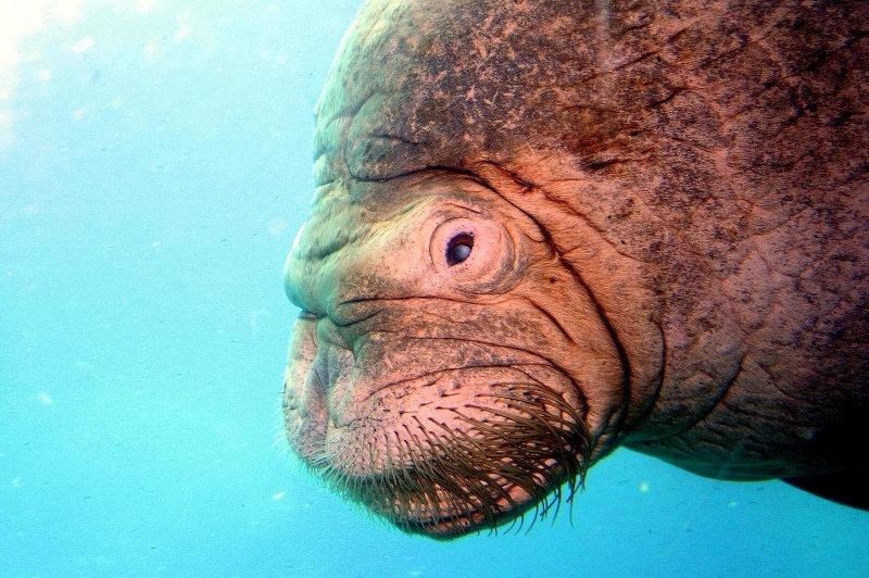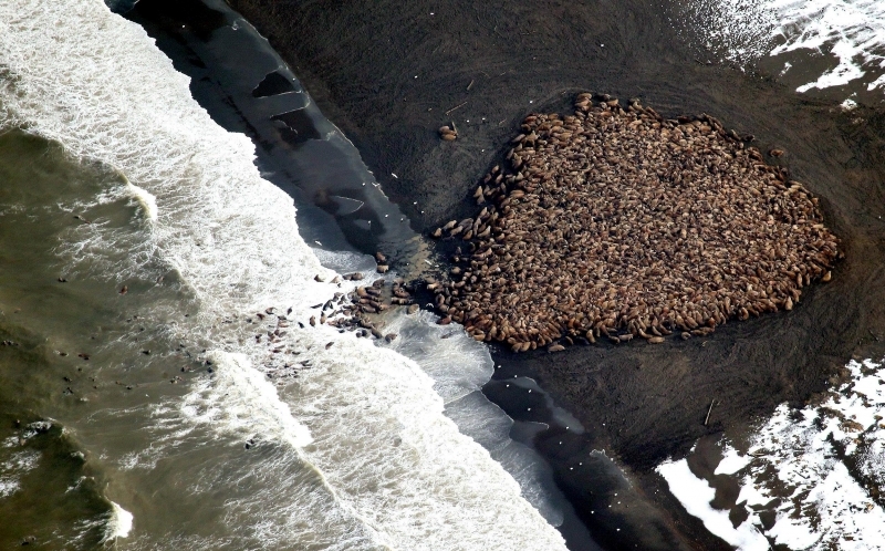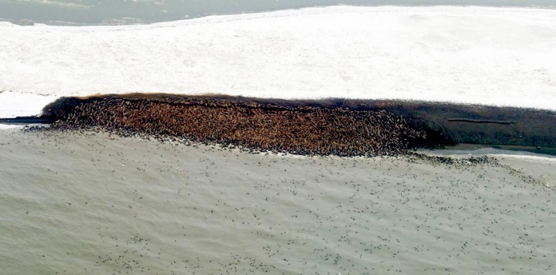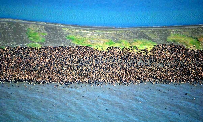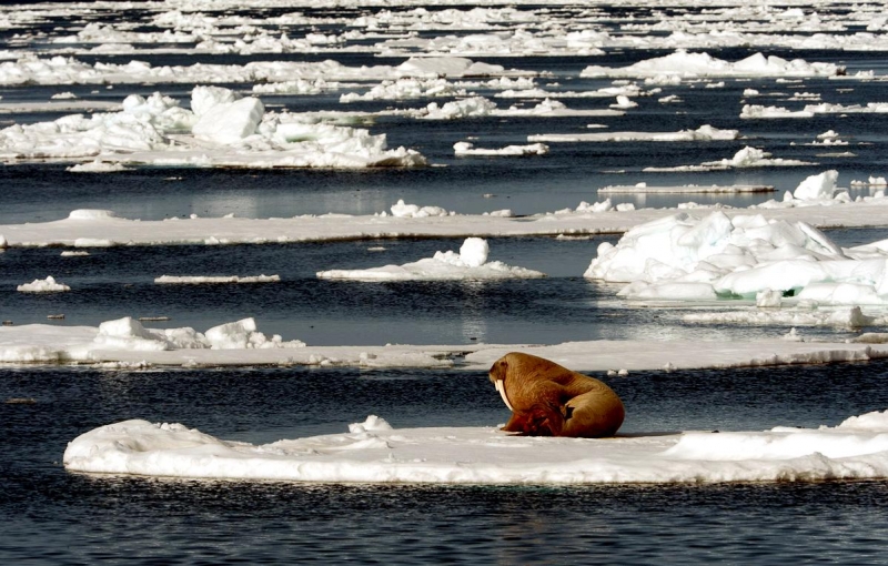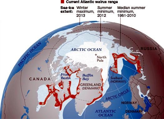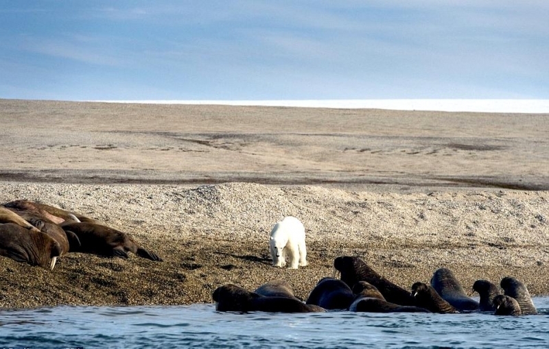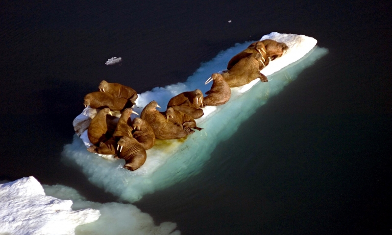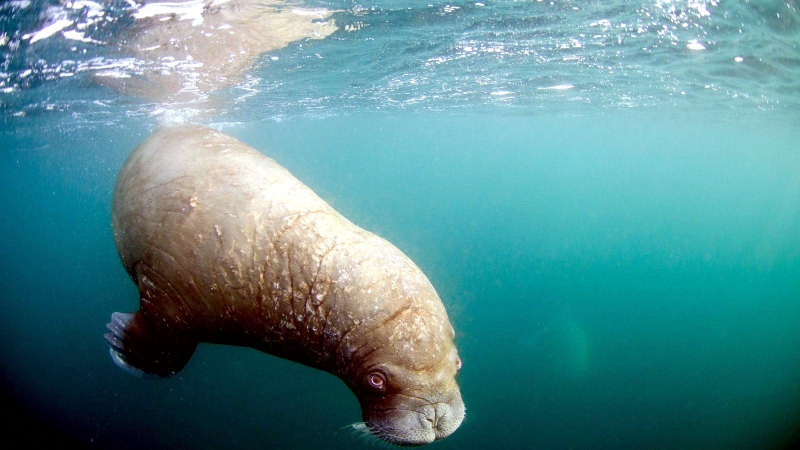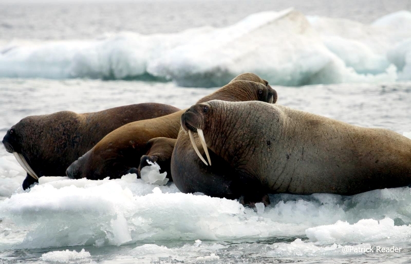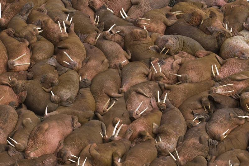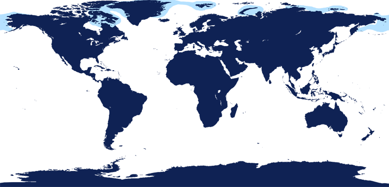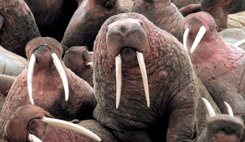 Walruses are only found in the Arctic regions of the world. Walruses inhabit areas in the Arctic that are largely made up of ice. Walruses prefer areas with shallow water so they can easily access food. This slow-moving marine mammal spends the majority of its time in or around water. The origin of the word Walrus is thought by to derive from a Germanic language and it has been attributed largely to either the Dutch language or Old Norse. The first part derives from the Dutch word walvis meaning “whale”. The second part comes from the Old Norse word for ‘horse’ hrossvalr and is thought to have been passed in an inverted form to both Dutch and the dialects of northern Germany as walros and Walross. Females spend more time on ice opposed to the males, who spend more of their time on sand or boulder beaches. Walruses migrate north during the summer and south in the winter. The migrations ensure that the Walruses can be where the most optimal ice is found. Optimal is defined as relatively thin ice but thick enough to hold the enormous weight of their bodies. Walruses are one of the largest pinnipeds. The Pacific Walrus tend to have a larger body mass than the Atlantic Walrus. This animal is known for their massive tusks, which are really just enlarged canine teeth. These tusks can break through 20 centimeters of ice. They also assist Walruses in climbing out of the water and onto the ice. The tusks can be used for the Walruses to defend themselves from larger predators and are also a way to establish dominance hierarchy among Walruses. Tusks can grow to a length of 90 centimeters but the average size is roughly 50 centimeters. Walruses have thick skin that ranges from a light gray to a yellowish brown color. Walrus pups skin color differs from the adult because they are usually solid grey, while adults can range in colors. The skin thickness varies across the body but is usually 2 to 4 centimeters thick. The layer of blubber underneath the skin can be as thick as 25.4 centimeters. Walruses have short fur in most areas of their bodies except their appendages. Walruses have whiskers to help them feel around on the ocean floor. They have relatively small eyes because they rely mainly on sense of touch to find food. They have short front flippers not only to swim but also to assist them on land. It uses its hind flippers as a motor to move its large body through the waters with the help of the front flippers to navigate which direction it will go in. Male have greater mass than females, weighing up to 1,200-1,500 kilograms and can be as long as 320 centimeters. Females of the same age can weigh 600-850 kilograms and grow to a length of 270 centimeters. Males also have longer & thicker tusks than females and thicker skin as well. Walruses are polygamous, meaning that a single male usually mates with many females.
