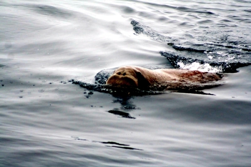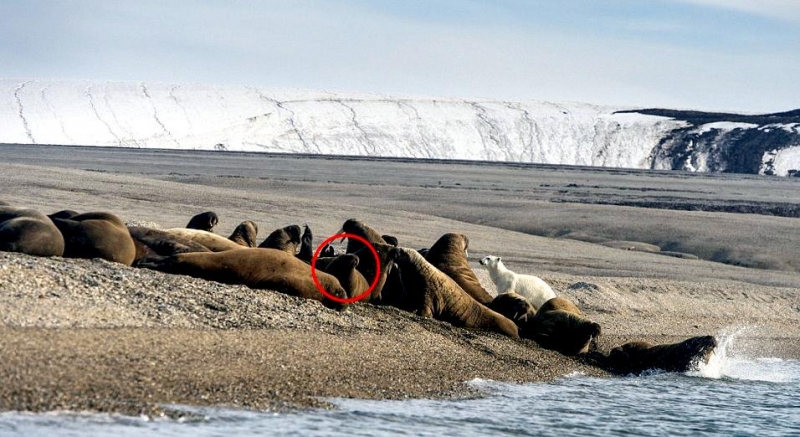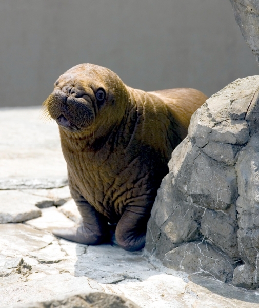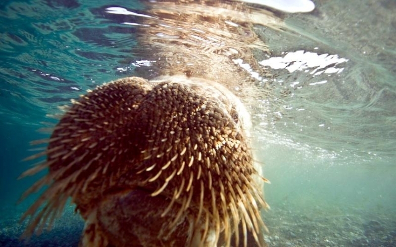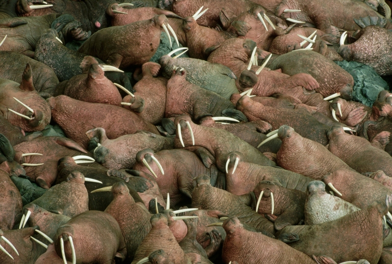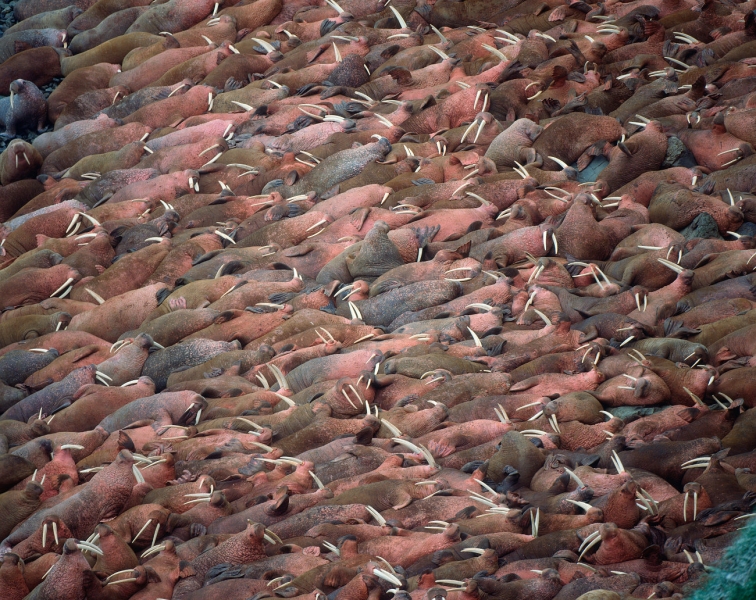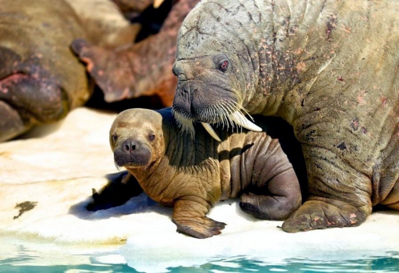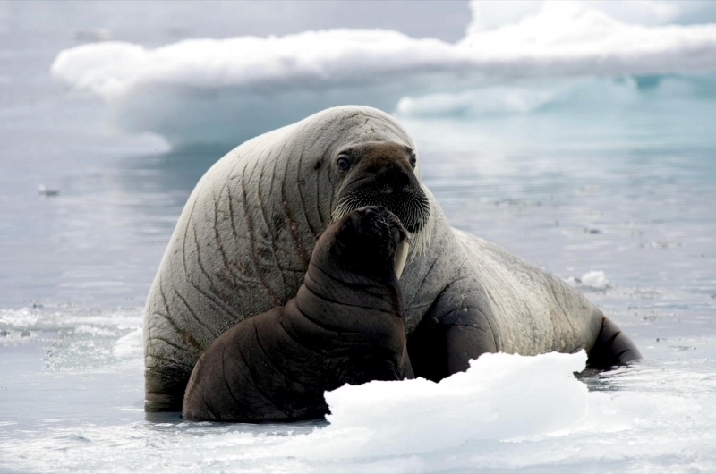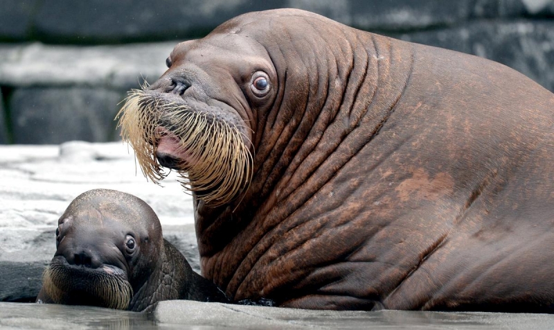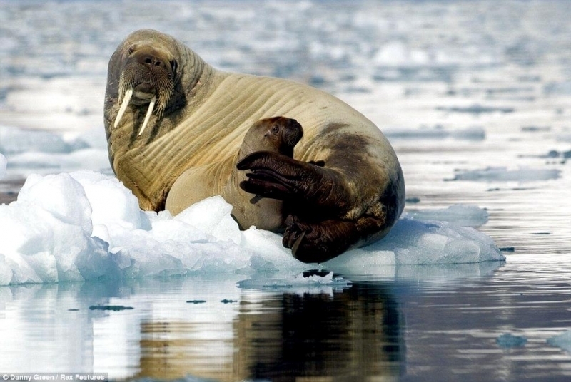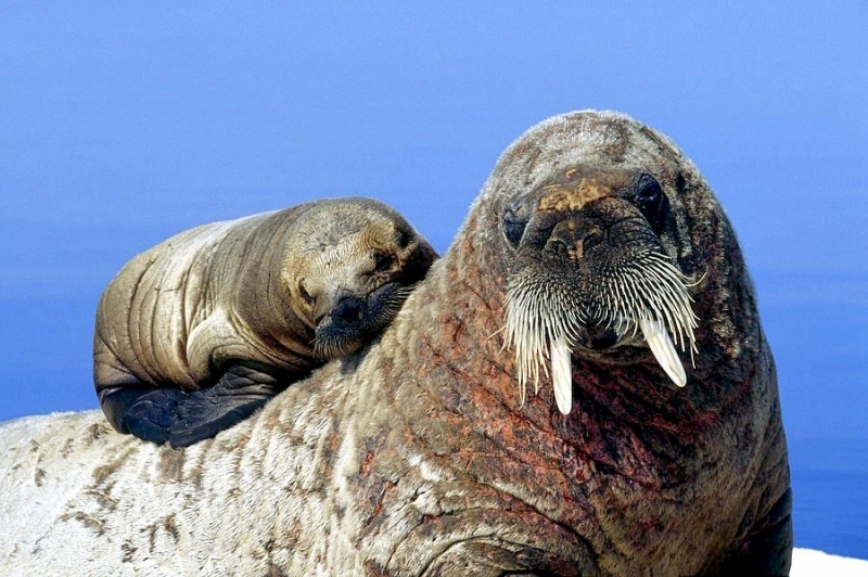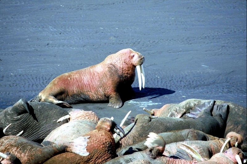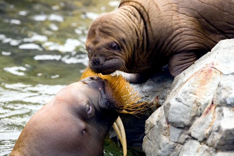 Males have many mating calls & noises they make to attract females during mating season and in order to mark their territory. Underwater, the males make bell whistling noises and thumping noises to get the attention of females. These noises not only attract females, but also serve as a warning to other male Walruses. These noises are meant to intimidate other Walruses. When it comes to mating, usually the strongest, largest and oldest of the males get to mate with the females. Tusk fights occur between males over who gets to mate with a group of females either on land or in water. Sometimes these fights can be very gruesome and even fatal. Females sexually mature between the ages of 5-7. Males sexually mature around ages 7-10 but don’t mate until they are approximately 15 years old, when they are socially mature. During the winter & summer, both male and female Walruses gather in the thousands to breed. Both sexes congregate in their haul-out sites which are rocky or sandy beaches to pick potential mates. However, mating is believed to take place in the water. Walruses produce offspring most of their lives. Females produce a single calf every 3 years. The average gestation period for a female Walrus is 15 months, which includes a 4-5 month delay in the egg implantation. Because Walruses breed between January and April, the baby Walruses will be born the next year between April and June. The average weight of a Walrus pup is about 60 kilograms with a length of 120 centimeters. When the calves are born, they immediately know how to swim. This along with the mother’s protection, decreases the chance for predation. Before the calves are weaned, they live with the herd of female Walruses. They are very dependent on their mothers for the first few years. At age 2, they learn to scavenge for their own food and by age 3, they are completely weaned. At this time, male Walruses join the male herd and females stay in the female group but are independent from their mothers. Females care for their pups until the pups reach 3 years of age. Males have no part in raising their young. The average lifespan for walruses is between 30 to 40 years in the wild. They have a high survival rate as calves due to the protection by the females. Lower life spans may be a result of poachers & hunters. In captivity, Walruses have been recorded to live up to age 30. However, ingesting objects that are not meant for eating & tusk infection could prevent a long lifespan in captivity. In artificial surroundings, the behavior between mothers & calves may cause problems such as malnutrition. Walruses live in a hierarchical system based on age, body size and tusk length. The older & stronger the Walrus, the higher up it will be in the hierarchy.