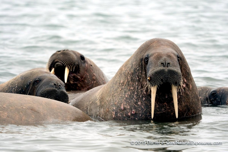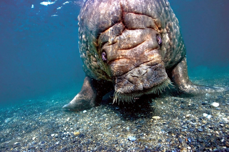 The male Walruses establish dominance and compete for females by fighting with their tusks. The tusk fighting takes place at haul-out sites, which are usually rocky or sandy beaches near the water. They go to these haul-out sites to rest & sleep. Walruses can move the fastest while in the water. Walruses are social and spend most of their time with other Walruses of the same-sex. Females stay in one herd, while males stay in another herd until breeding time. Sometimes the packs can range from hundreds to thousands. In the winter & summer, male and females come together in large groups and get very close to each other sometimes even piling on top of each other. Walruses have small eyes that are adapted to the cold environment. Some fat cells are in place to help keep the eyes warm. Some studies indicate that Walruses can see in color, but the range of the color spectrum is unknown. Walruses has short-range vision and often cannot see when they are on the ocean floor scavenging for food. The whiskers also called vibrissae, are used for feeling their way around the ocean floor. Walruses use their whiskers to help identify food or any other small objects. They can hear relatively well on land but under water, they use a system of tissue conduction to hear. This system closes their auditory meatus and only allows them to hear through their outer ear tube. Walruses are vocal mammals. They communicate during mating season, when they have mother & calf interactions and when establishing dominance among others. Walruses have a series of grunts & barks they will use in the situations described above. The Atlantic population and the Pacific population have slightly different vocalizations. A study showed that Walruses could differentiate between the two different subspecies vocalizations. Walruses mainly feed on small invertebrates, most commonly consuming bivalve mollusks. It is unknown exactly how Walruses find them. however it is known that they use their hind fins to propel them forward, while their tusks, mouth & whiskers drag the bottom of the ocean floor in search of food. Once the Walrus has obtained a mollusk, it uses a suction method to ingest the inside after its mouth & tongue have opened the shell. Occasionally a different method is used to get shellfish open by crushing them open with their rounded teeth.