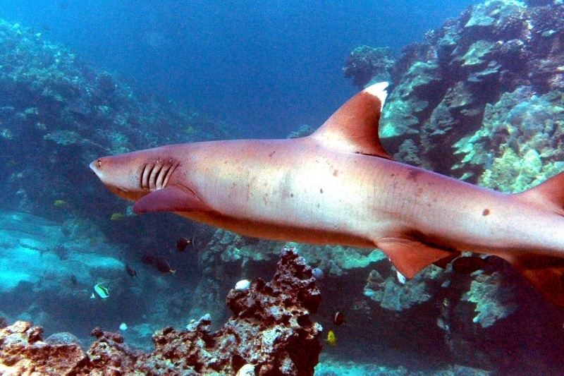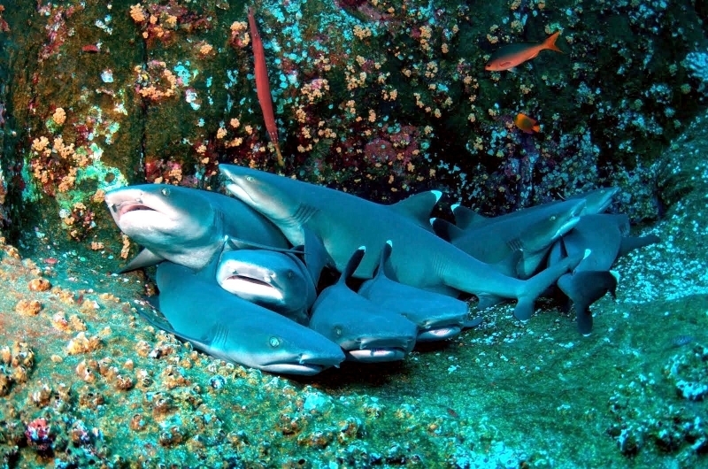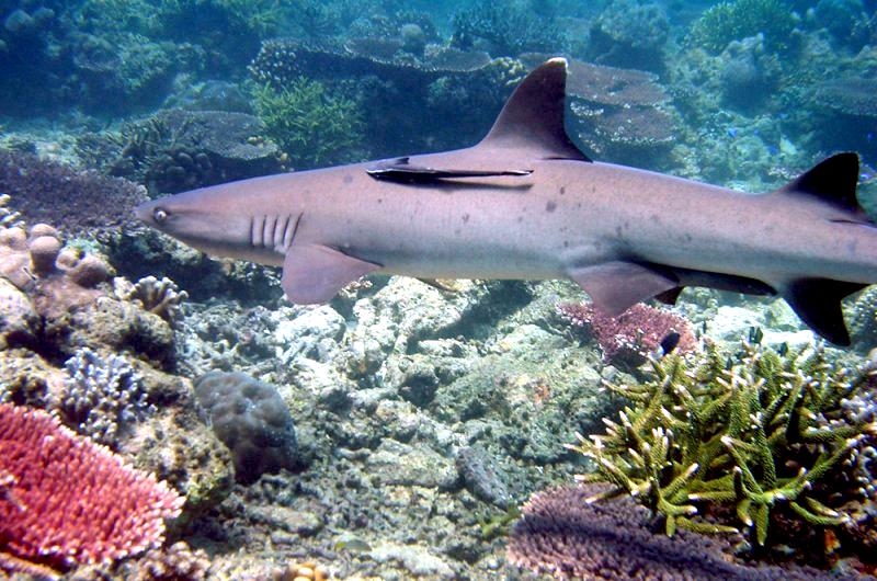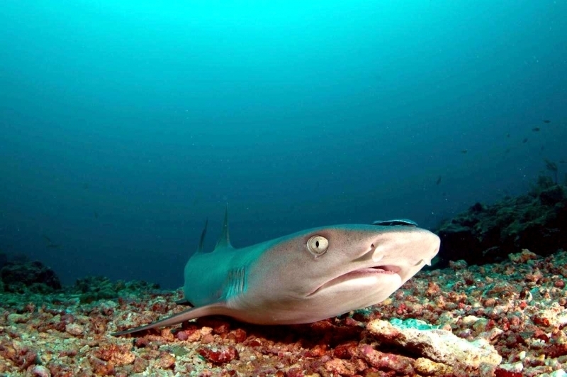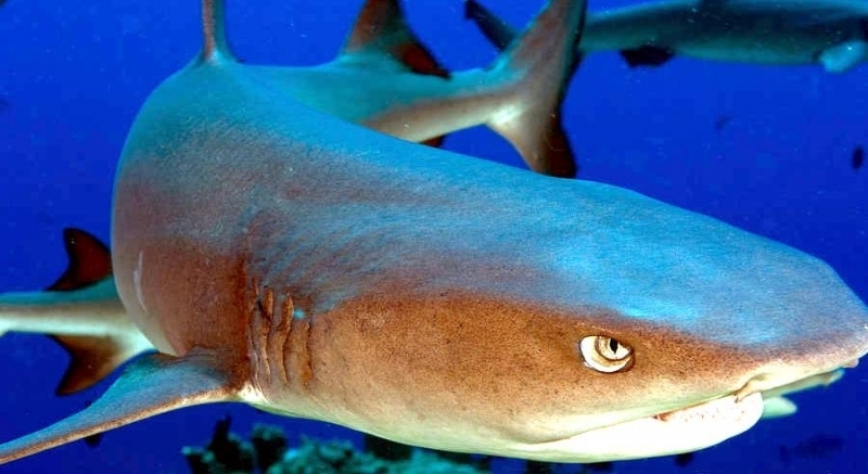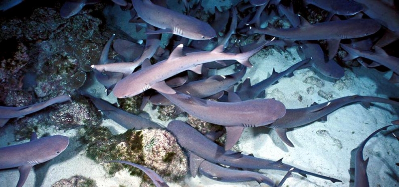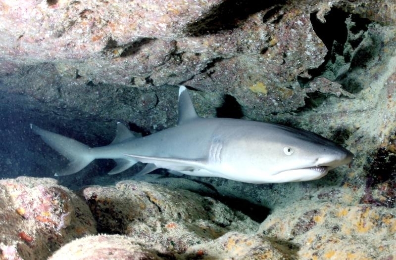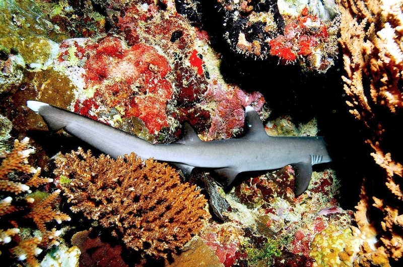 Highly social, these sharks often lie together in groups on the bottom, stretched out side-by-side and even stacked on each other like chord wood. Home ranges of individuals are very small, typically only 0.5 kilometers or so. In Australia they are recorded from northwestern Australia, around the tropical north & south to the Queensland coast. They are one of the most abundant species found near coral reefs, together with Blacktip Reef Sharks and Gray Reef Sharks. They prefer shallow water but have been found down to 330 meters. These sharks live near the bottom or in caves and crevices. Compared to typical reef sharks, this species swims in a more undulating manner. They are primarily nocturnal, but seem to be correlated with tidal ranges. Whitetip Reef Sharks can be found in the same area for months (a few square kilometers) but territoriality is not known. They are sluggish inhabitants of lagoons & seaward reefs where they are often found resting in caves or under coral ledges during the day or usually on a sand patch or in a channel. Whitetip Reef Sharks are more active at night or during slack tide in areas of strong currents. They are known to travel distances from about 0.3-3 kilometers in periods up to about 1 year.