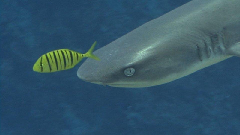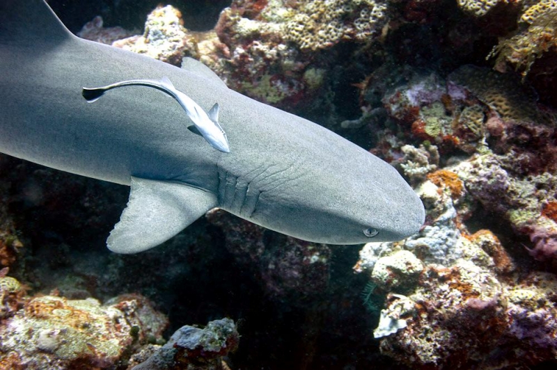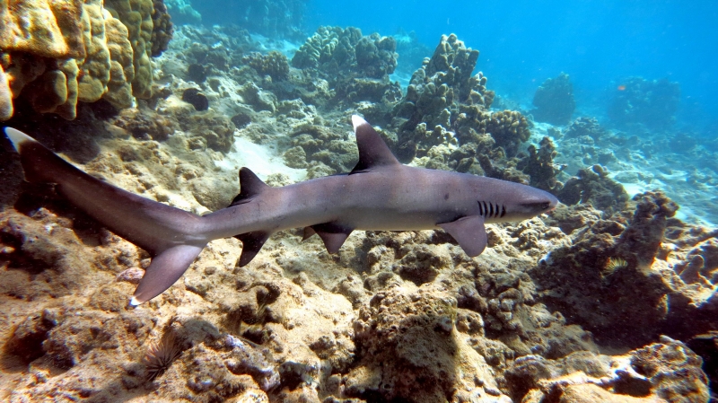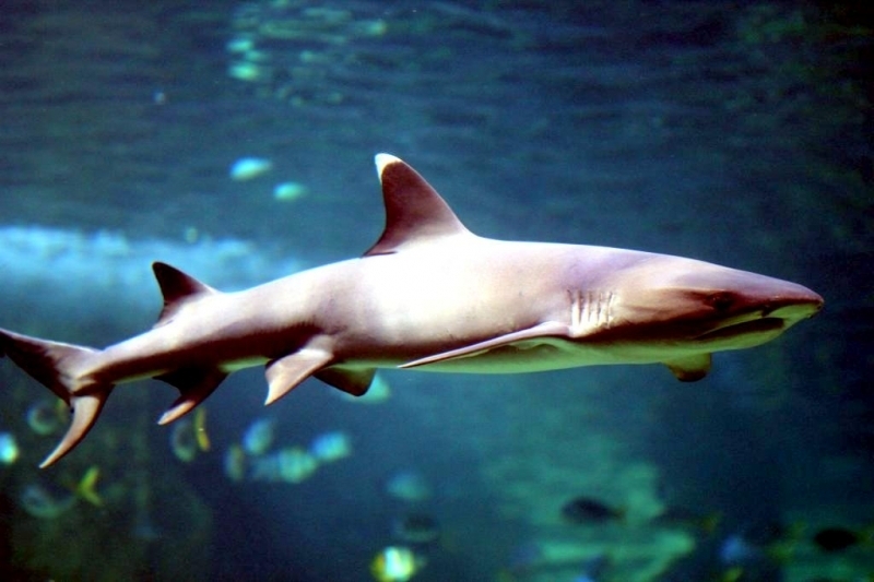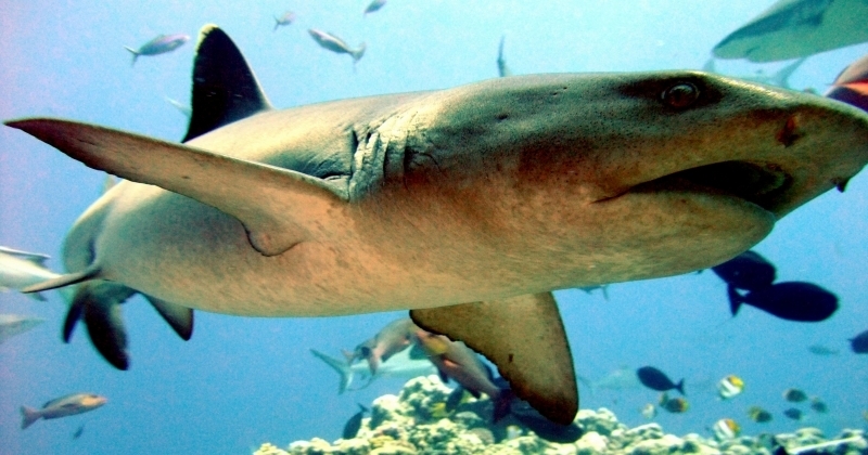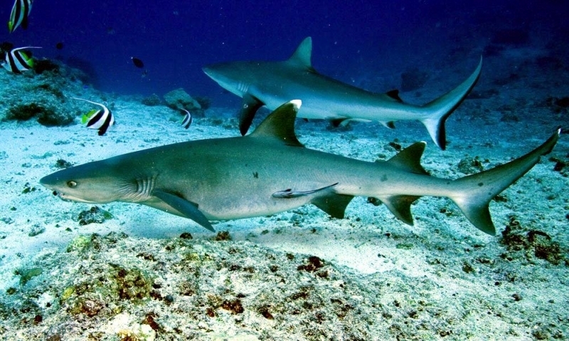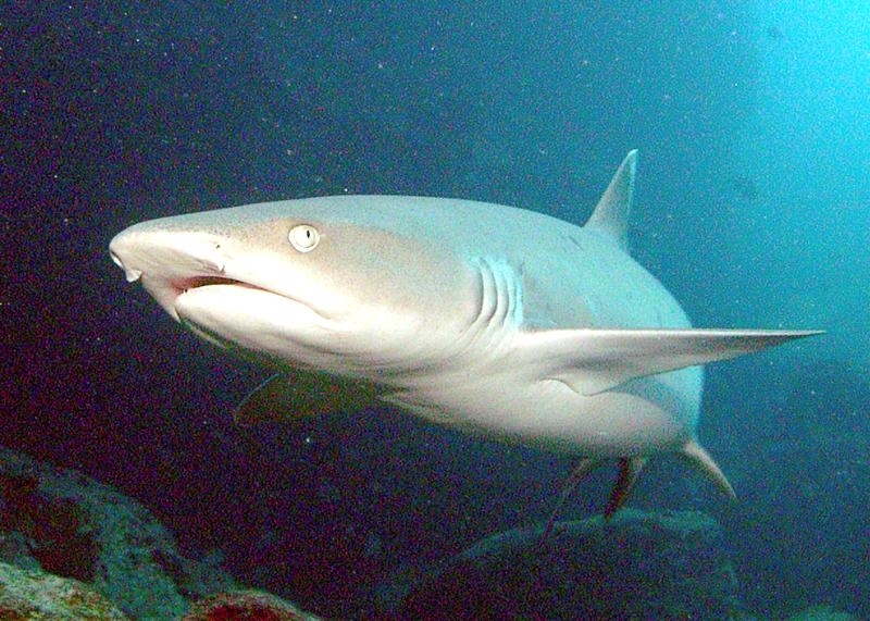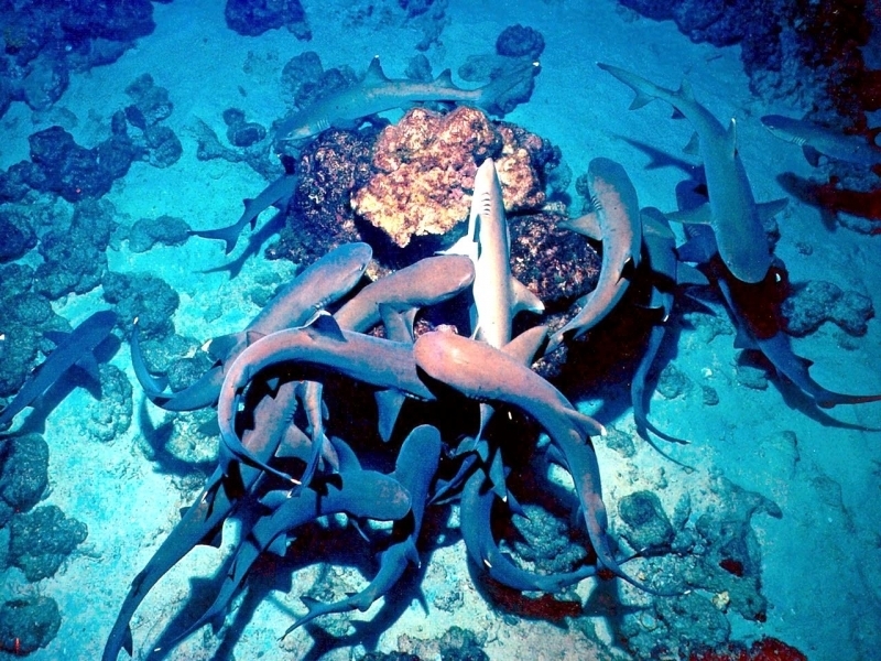 Highly social, these sharks often lie together in groups on the bottom, stretched out side-by-side and even stacked on each other like chord wood. Home ranges of individuals are very small, typically only 0.5 kilometers or so. In Australia they are recorded from northwestern Australia, around the tropical north & south to the Queensland coast. They are one of the most abundant species found near coral reefs, together with Blacktip Reef Sharks and Gray Reef Sharks. They prefer shallow water but have been found down to 330 meters. These sharks live near the bottom or in caves and crevices. Compared to typical reef sharks, this species swims in a more undulating manner. They are primarily nocturnal, but seem to be correlated with tidal ranges. Whitetip Reef Sharks can be found in the same area for months (a few square kilometers) but territoriality is not known. They are sluggish inhabitants of lagoons & seaward reefs where they are often found resting in caves or under coral ledges during the day or usually on a sand patch or in a channel. Whitetip Reef Sharks are more active at night or during slack tide in areas of strong currents. They are known to travel distances from about 0.3-3 kilometers in periods up to about 1 year.