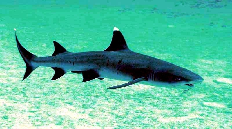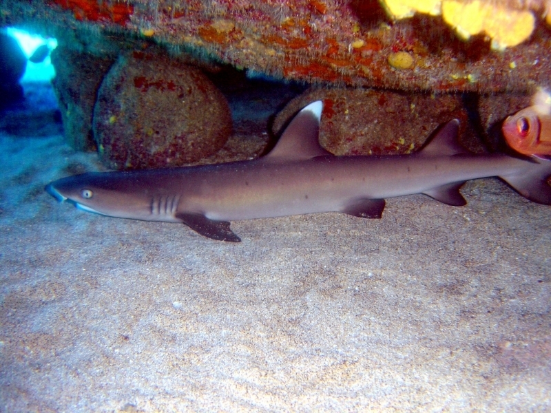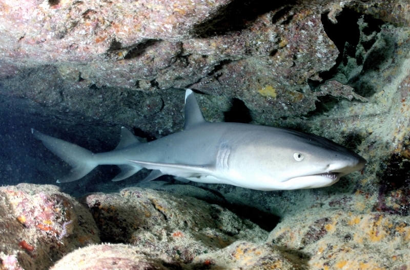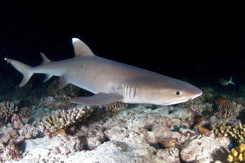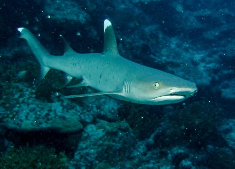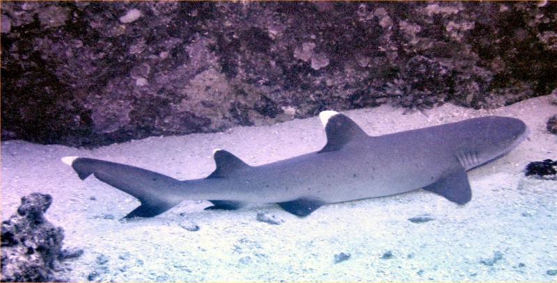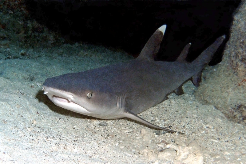 Whitetip Reef Sharks are a slender species with a short, blunt snout. They are brown-gray on their dorsal (top) sides, white on their ventral (lower) sides. They have scattered dark gray spots along the sides of their bodies. The tips of their first dorsal fin and upper caudal (tail) fin lobe are brilliant white. The tip of their second dorsal fin and lower caudal fin lobe are also white in some animals. Spiracles usually present, teeth are tricuspidate (three-pronged, with a smaller secondary cusp on either side of the central blade) numbering 47-50 upper/44-46 lower jaw, in at least 2 functional rows. This species is reported to grow to 2.3 meters in length but adults over 1.6 meters long are rarely seen. Maximum published weight is 18 kilograms and the maximum reported age is 25 years. Whitetip Reef Sharks are found in tropical marine waters, are most abundant on the reef areas and during daylight hours are often associated with coral reefs or lying on the bottom in caves and under ledges. Individuals often return to favored resting sites at the same times each day, often for several years.